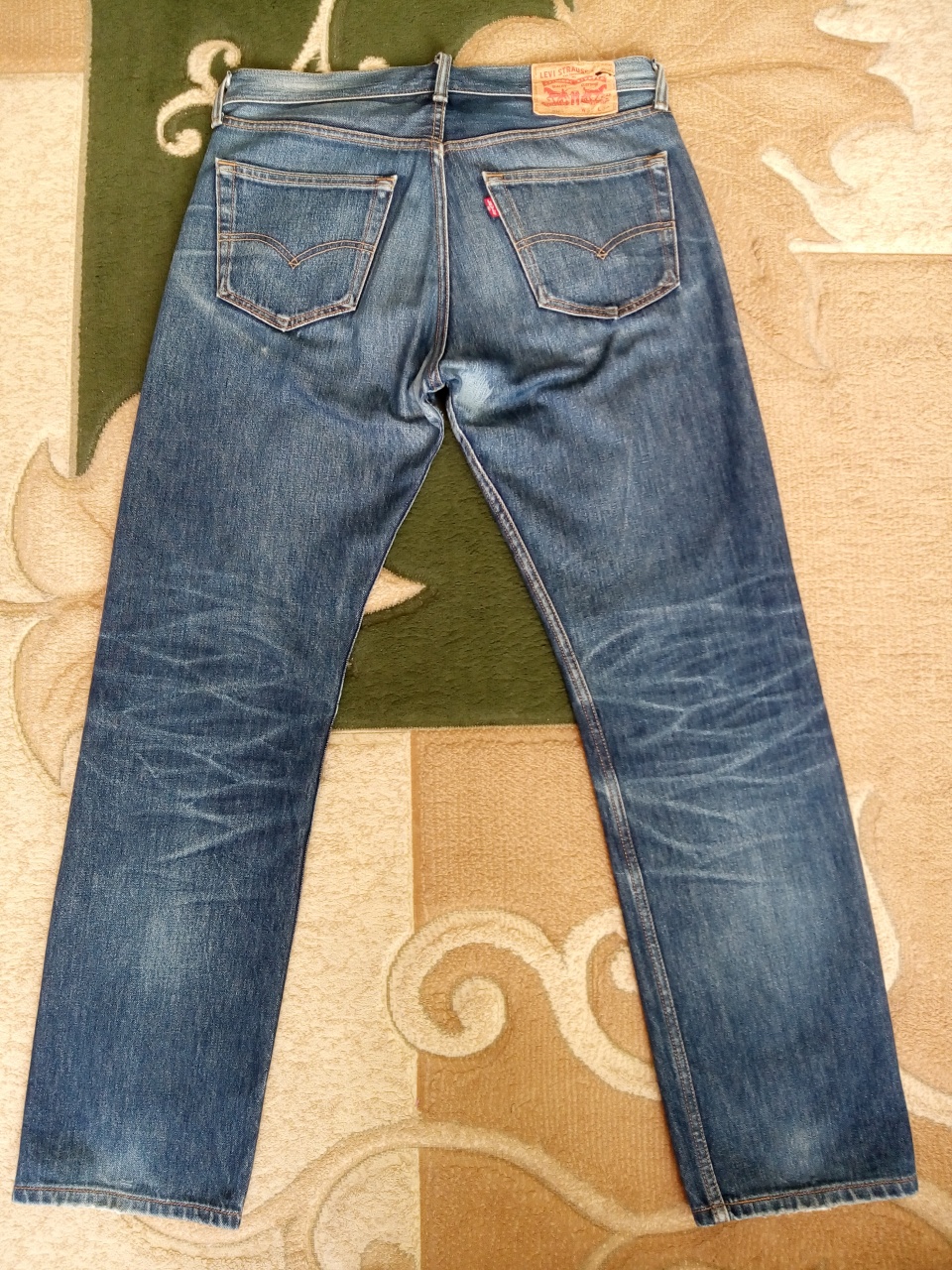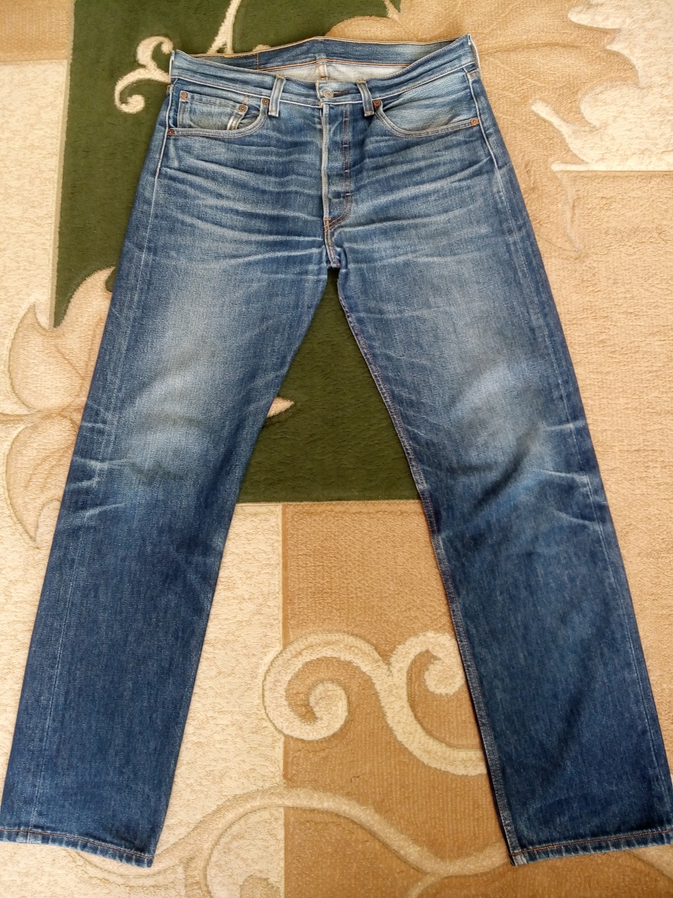 Денимчик стиранный, но ровный (как будто отглаженный) и гладкий, без малейших намёков на рыхлость и слабистость. По плотности вполне соответствуют заявленным 11,9 унциям. Фит выраженный морковный, с бедром в 30см, колене – 21 и леге – 18, т.е., классический слим тэйпед.