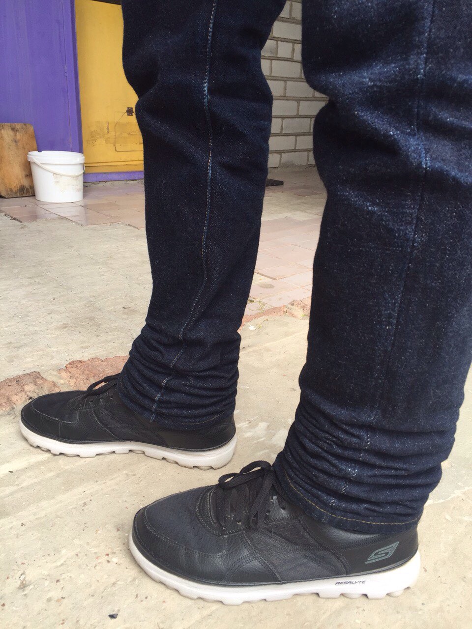 Деним носился в сыром неусаженном состоянии , изначально жёсткий , складки формируются как на мокрой бумаге и не исчезают даже после стирки .