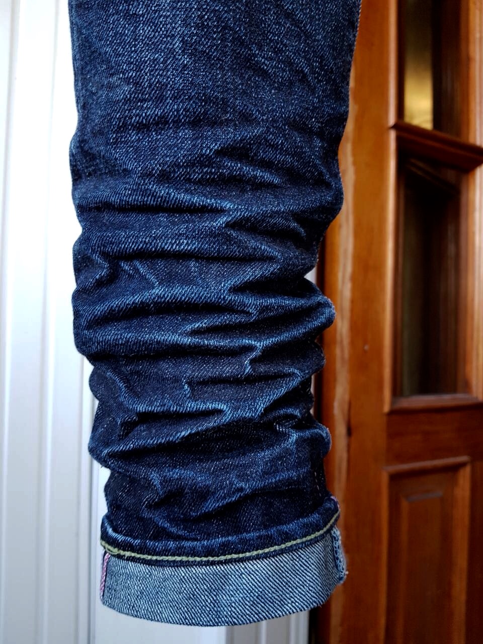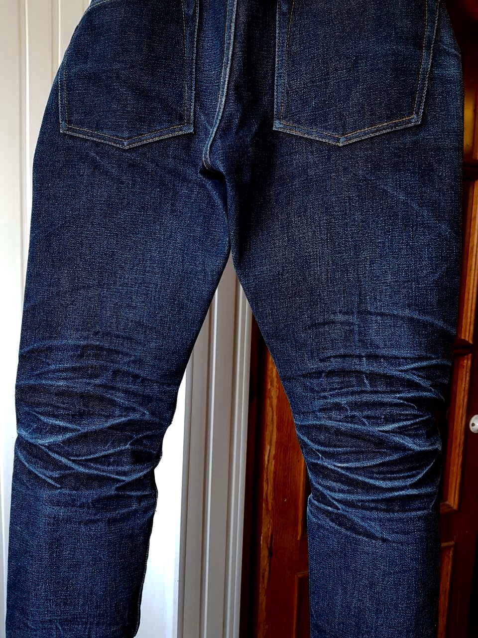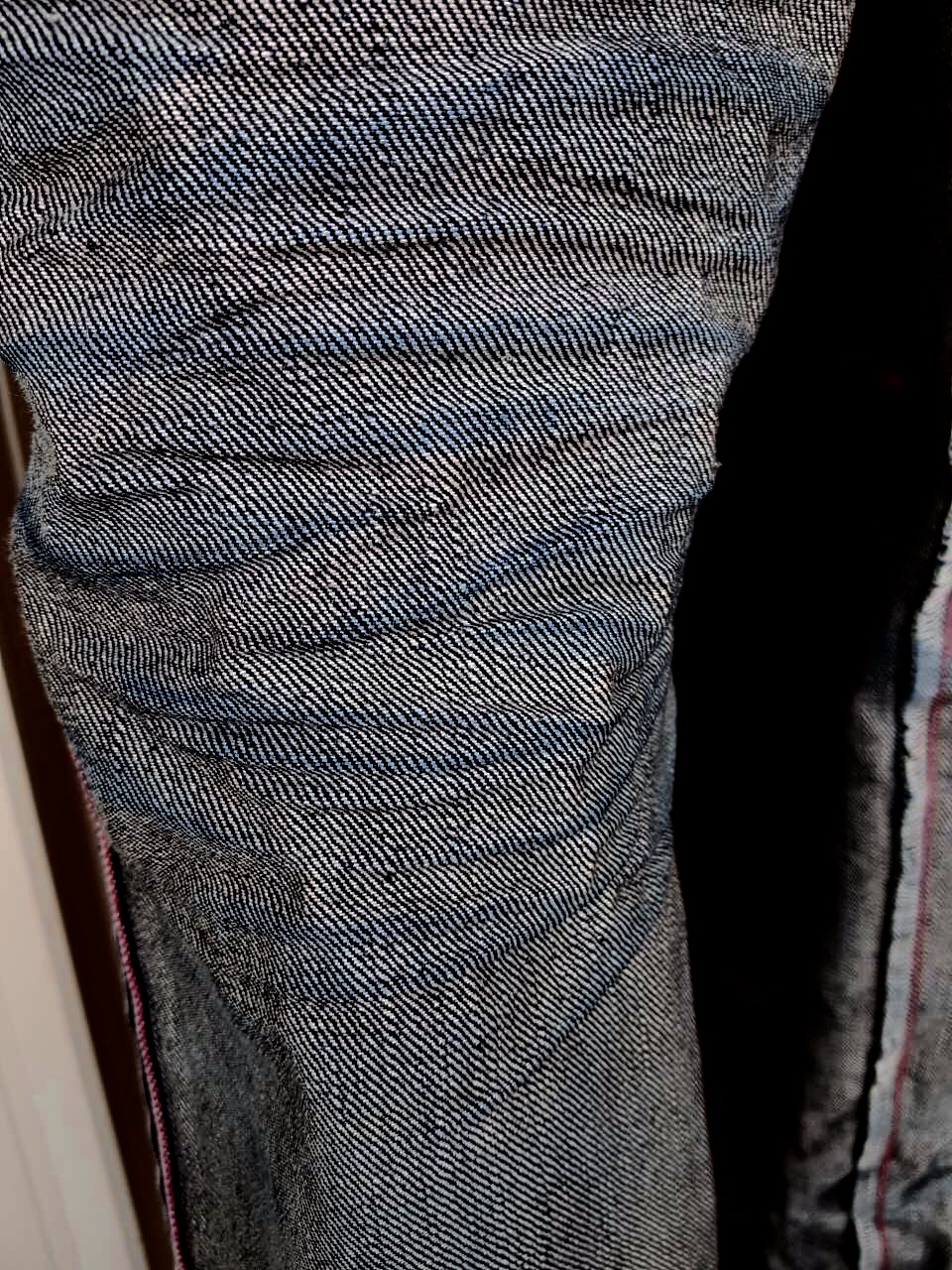 Деним , кстати , тоже неплохо подошёл для этого эксперимента ...собран из Зимбабве , но очень плотно ...без намёка на прослабление. Там , где удалось смочить деним ( по коленями , гармошку) , заложились коржистые , острые , как лезвие ножа, складки