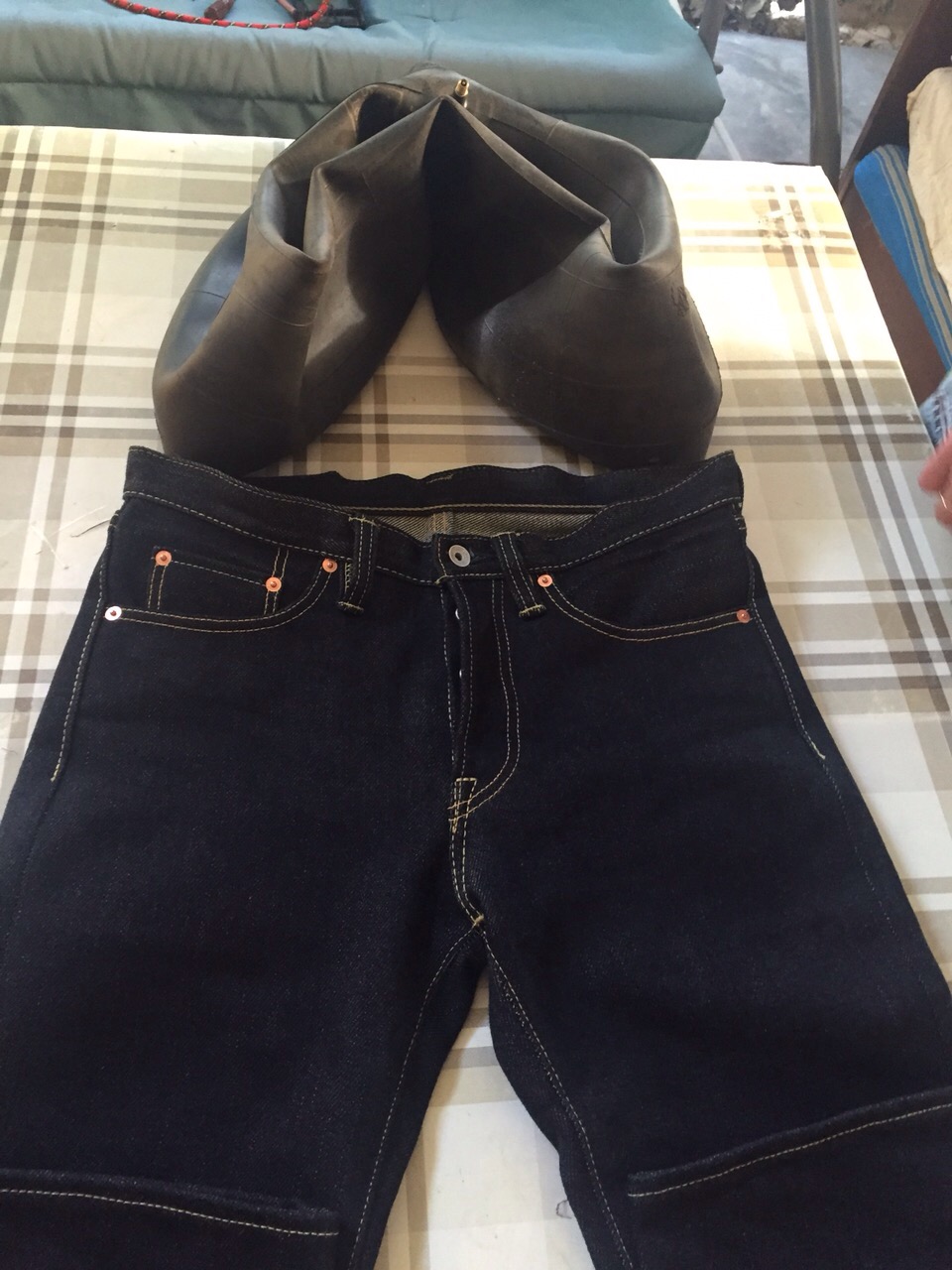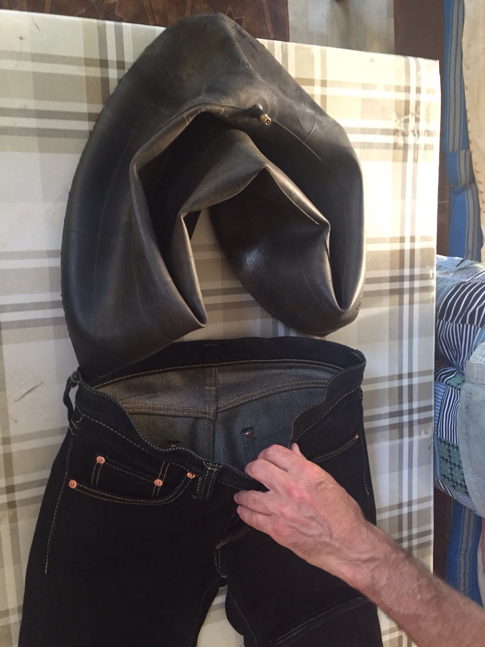 Берём автомобильную камеру от легкового авто ( в моем случае- R 15). Формируем её в спущенном состоянии в виде буквы " V" и вставляем в СУХИЕ джинсы в направлении бёдер. Производим предварительную накачку камеры, следя за равномерным распиранием верхнего Блока и бёдер на сухих джинсах . Затем, обильно смачиваем джинсу в местах соприкосновения с камерой, периодически повышая давление.