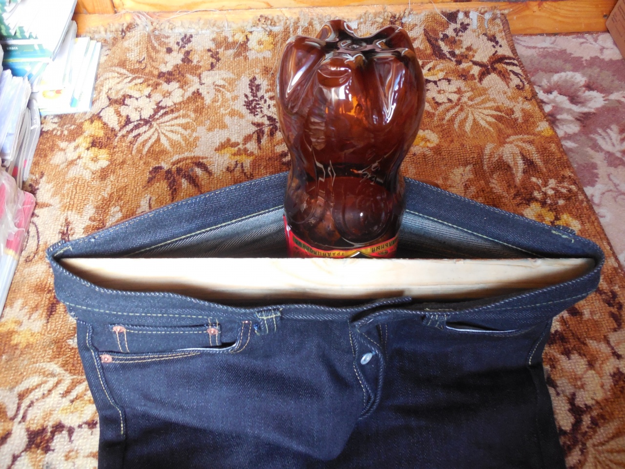 Покупая RAW джинсы трудно ошибиться с размером.Если велики,то можно усадить их по жестче до нужного размера.Если малы,то можно потянуть спец.средствами,а можно и с помощью подручных материалов.Растянуть пояс джинс 12-16 oz на 1-2,5 см можно вручную,просто растягивая его по всей длине несколько раз.А вот с тяжелым денимом более 20 oz сложнее,но растянуть можно.