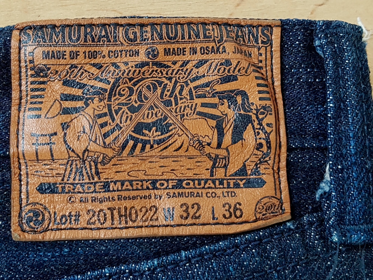 Патч изготовлен из толстой (3-4 мм) кожи. Это необработанная кожа растительного дубления, которая будет красиво стареть и приобретать более тёмный оттенок со временем (вплоть до коричневого). Красивое изменение цвета кожи будет подчёркивать фейдинг этих джинсов, что выглядит очень красиво.