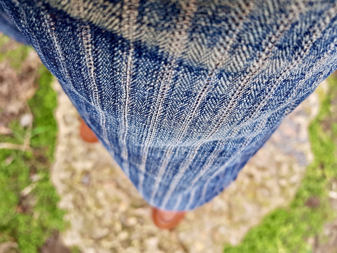 Да это узнаваемый тип ломаного переплетения. При этом производитель использует плотность чуть выше средней. Таким образом удаётся сделать этот деним универсальным для различных времён года и в то же время придать более выразительную фактуру, чем это могло бы быть у менее плотного денима. Даже сразу из пакета, когда крахмал ещё не смыт а деним приятно похрустывает, фактурность и лёгкая неоднородность уже была видна.