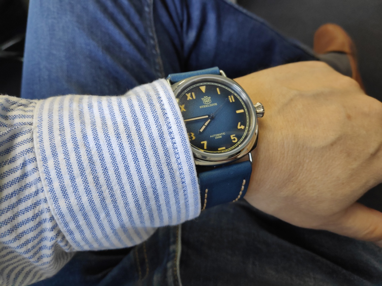 Вчера пришли Steeldive. С прошлого года смотрел на них, но варианты с зеленым и черным циферблатами не нравились. Синие стрелки с зеленым цифером сочетаются не ахти. А черный циферблат - равномерного цвета, без градиента. Часы с ним мне казались простоватыми и скучноватыми. Даже связывался с их "официальным" магазином и спрашивал, не планируют ли выпустить синий цифер. Ответили, что не планируют.