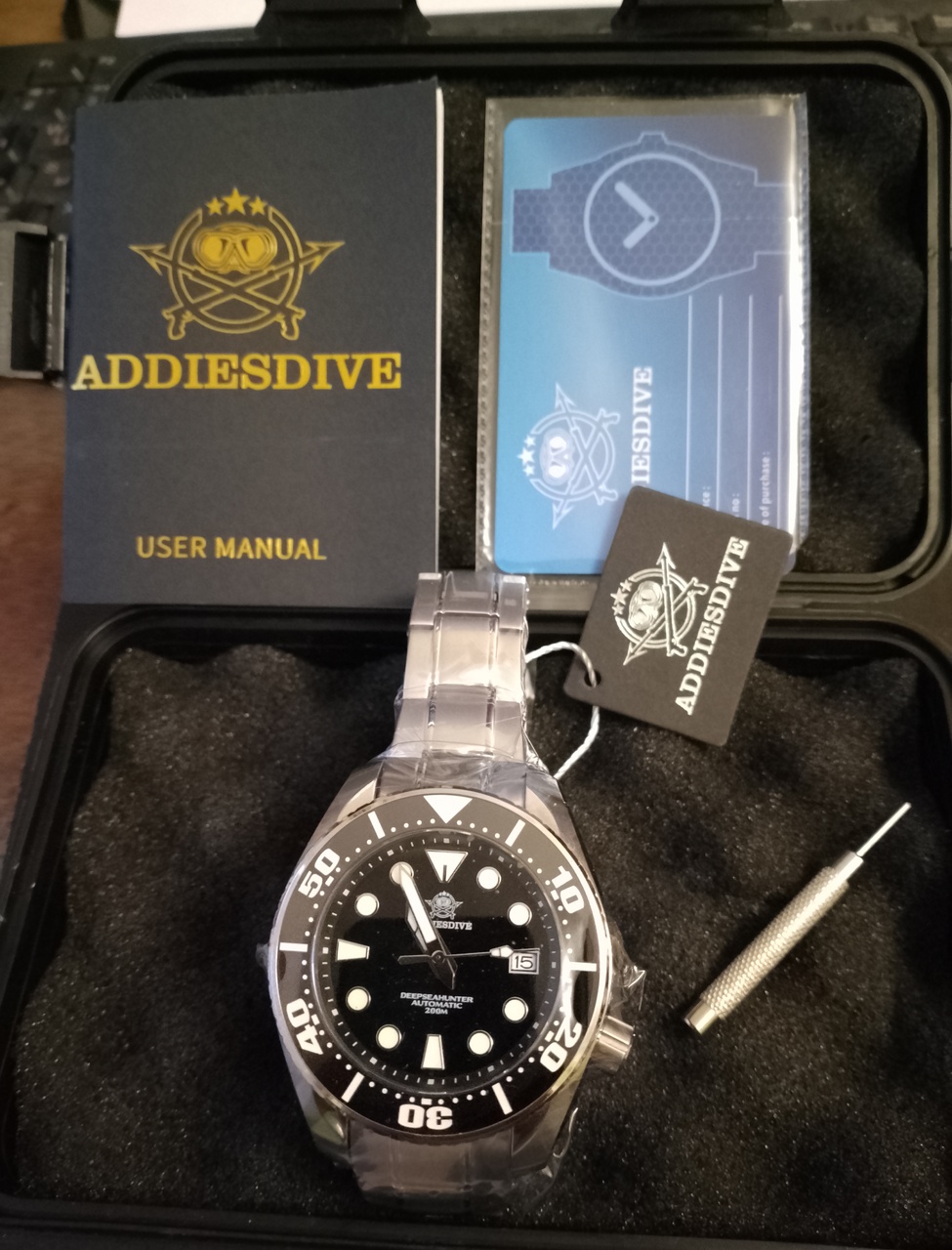 Пополнение моей коллекции ещё одними дайверами. Кстати, что у СтилДайв, что у АддиесДайв механизм трещёки безеля очень хреновый, основанный на круговой многоугольной проволоки. У СтилДайвов он у меня вышел из строя, проволока лопнула, или вышла из паза. У АддиесДайв - механизм тот же, поэтому стараюсь безель вообще не трогать от греха подальше. Определил по звуку. Звук характерный.
