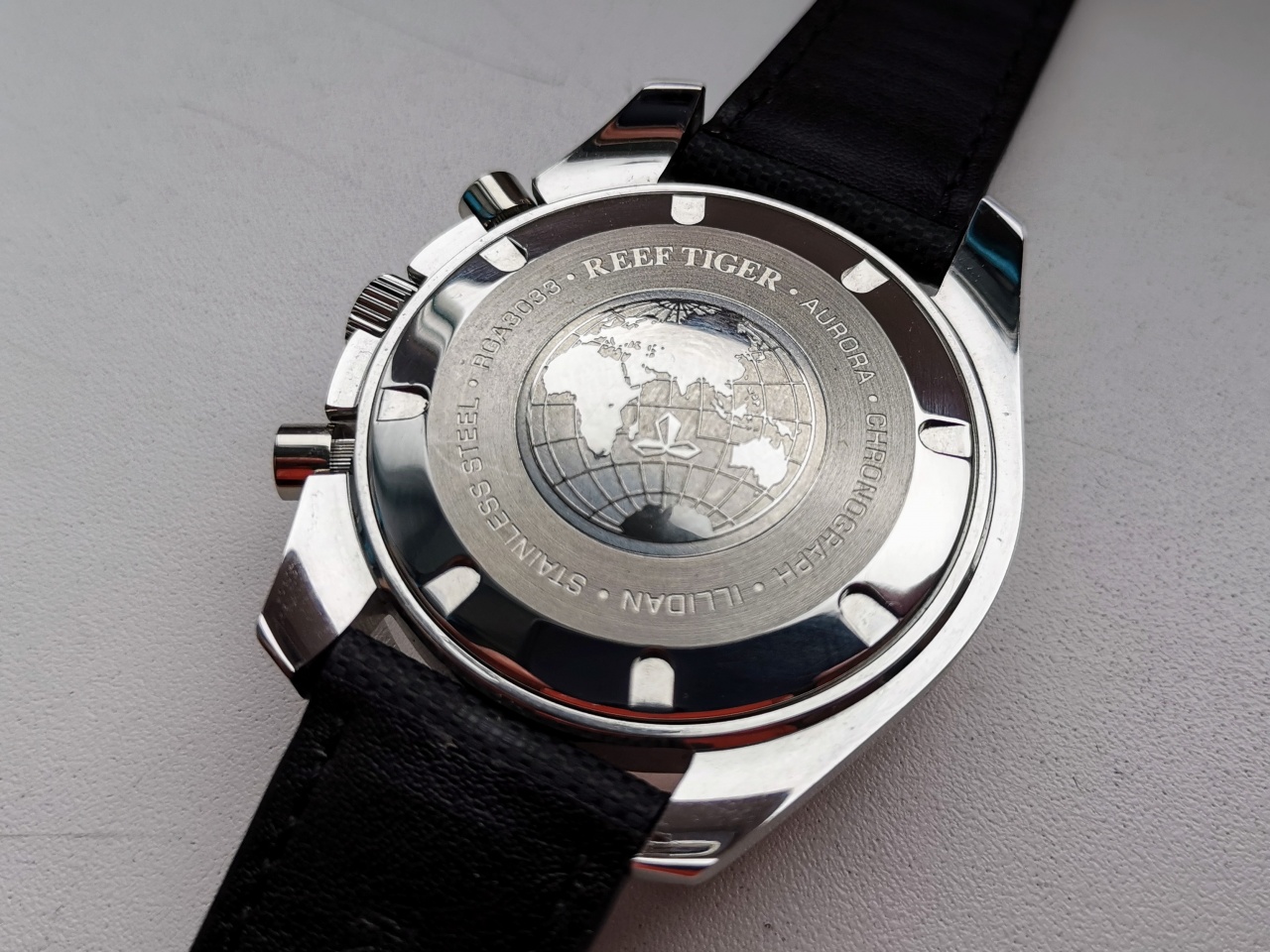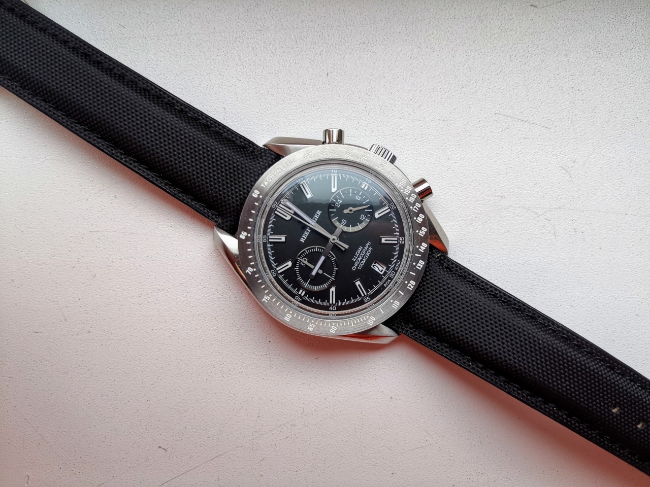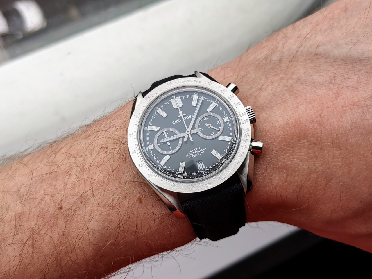 Не люблю большие часы, тк запястье узкое, но рифы покорили меня! Диаметр у них 44мм по корпусу и 42мм по безелю, размер lug to lug 50мм, получается, что визуально они выглядят меньше, чем на самом деле.