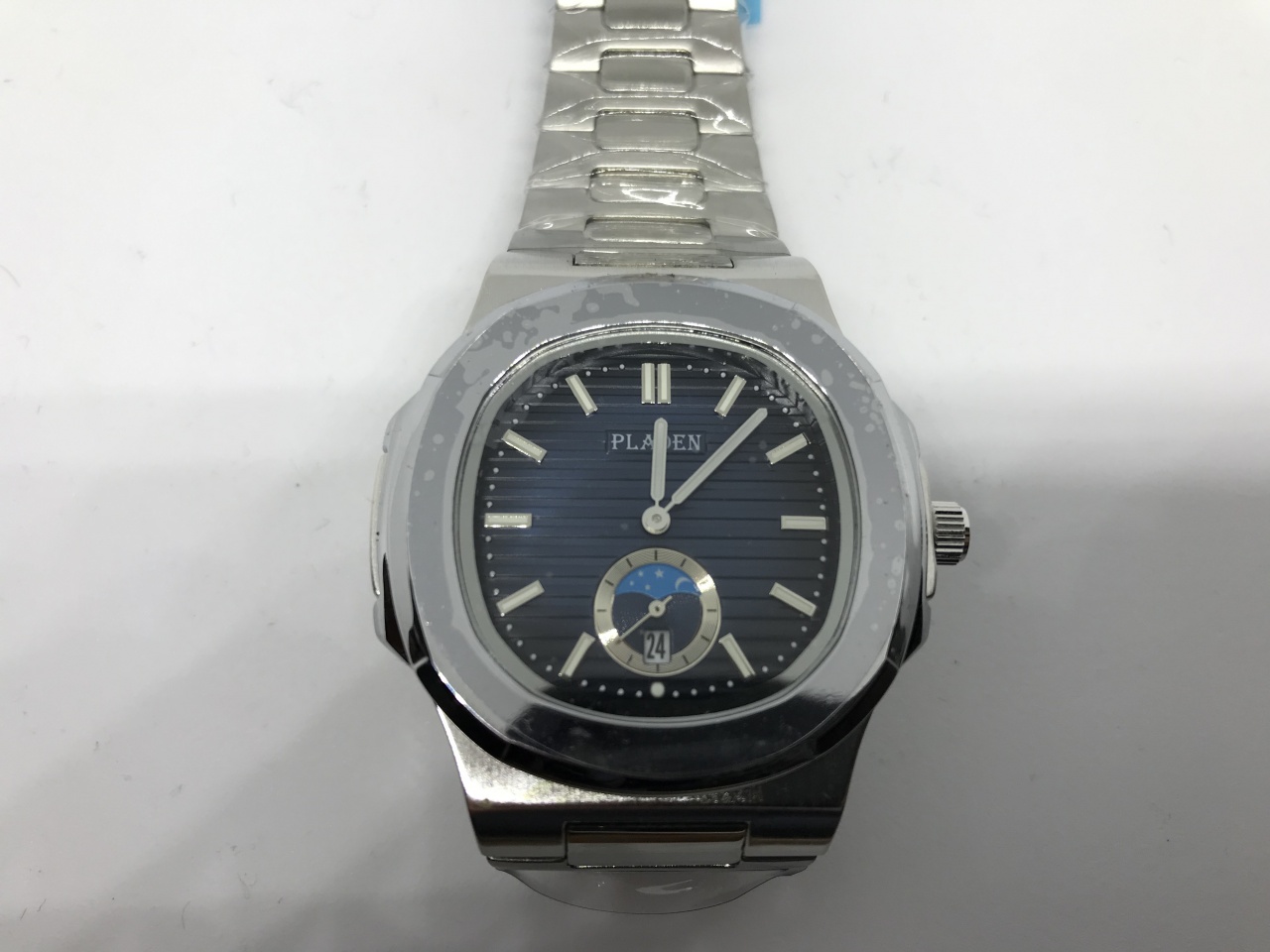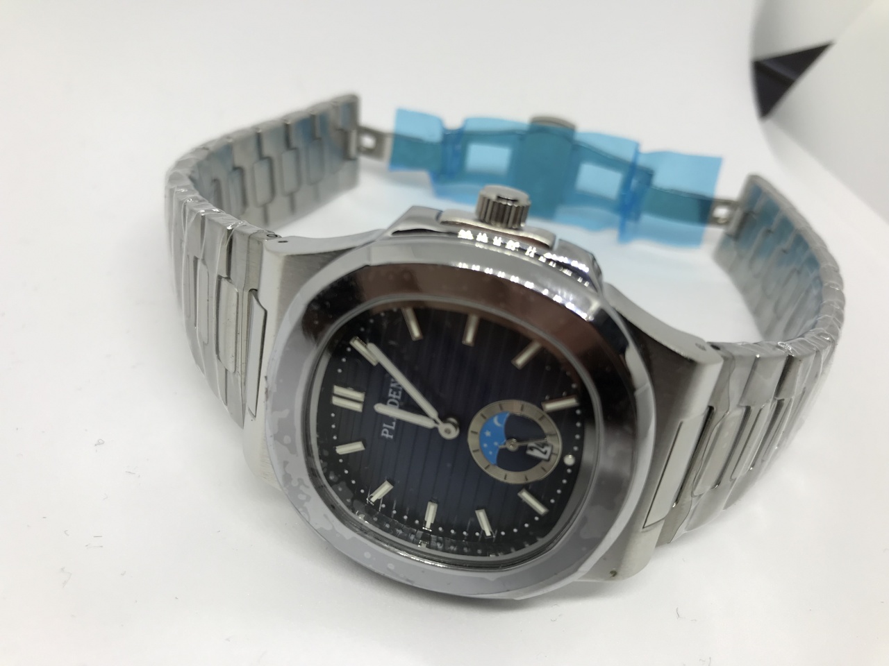Получил недавно кварцевые часы Pladen - хомаж Patek Philippe Nautilus. Часы пришли в картонной коробочке с инструкцией. Корпус часов похоже изготовлен из какого-то сплава, браслет - стальной, литой, увесистый, солидный. Есть индикатор даты. Лунный календарь оказался имитацией, он просто нарисован вокруг окошка, изображая звёзды и луну