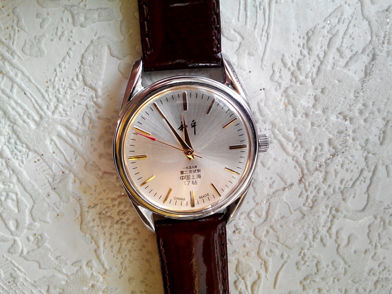 часы жены , вернее это мои бывшие часы ! Заказал их в китайском инет магазине , часы Classic Shanghai Peace hand-winding mechanical watch reissue , эдакая реплика на часы Shanghai 1958 года , понравился ретро дизайн, риск минимален , т.к. по тем временам 50$ за такие часы , это дешево . Но не учел , что размер часов 35 мм, что даже для моей не крупной руки - мало . Понял , что носить не буду и жена с радостью конфисковала их , пересадил на женский ремешок , теперь носит и ей нравится