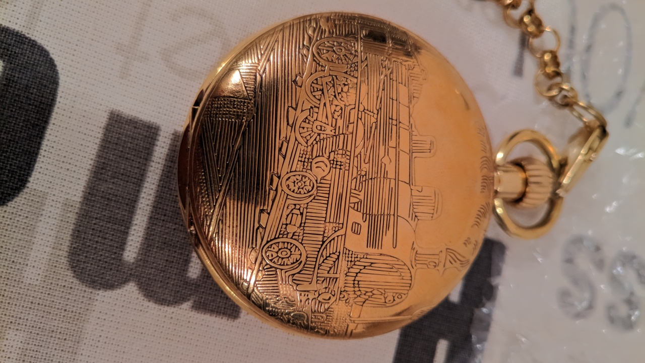 Над 12 заводная головка с кнопкой открывания крышки, защитным кольцом с цепочкой. На лицевой и задней крышке выштаповка паровоза. Внутри крышки рисунок концентрических окружностей, как от проточки резцом.