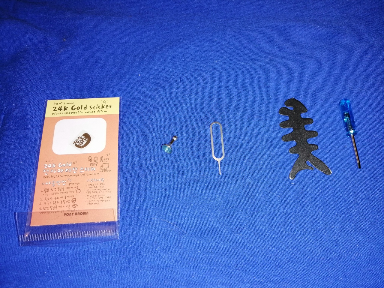 В комплекте помимо псевдо-гарантийного талона и инструкции, куча всякой фигни. Наклейка для телефона, с защитой от электромагнитного излучения ( странно, что шапочку из фольги не положили), скрепка для доставания сим-карты, затычка со стразиком для гнезда наушников (не держится кстати в Хуавее, выпадывает), картонная ёлочка (ребёнок сказал, это какая-то подставка для наушников), странная черная фигня с иероглифами – гугл переводчик сообщил, что это подставка для телефона. И последнее – голубая фигня размером с кредитку. Если кто знает, подскажите что это? Я так подозреваю, возможно, крепление для разборки браслета?