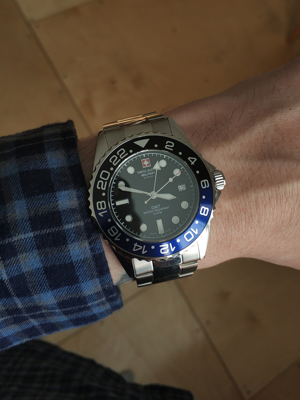 Коллеги, хочу поделиться с Вами последней своей находкой, пусть и не совсем по профилю темы (но в любом случае не уверен в реальной "швейцарности" данной марки). Давым-давно искал себе GMT в классическом стиле и именно на кварце, выбор тут небольшой, а того, что нравилось еще меньше, сначала думал насчет Штурлинг'а, потом по счастливой случайности наткнулся на данное изделие. Корпус и браслет сталь, корпус целиком полированный, кроме задней крышки, браслет литой, кроме оконечных звеньев, что странно, конечно. После СанМартина (других китайцев, кроме мельком проскочившего спидмастера Пагани небыло) качество обработки вообще не впечатляет. Стекло заявлено сапфир. Безель однонаправленный на 120 кликов, сначала был невероятно тугой, потом приработался, вставка алюминий. Размер по корпусу 42мм, от ушка до ушка 49мм, толщина около 11мм, но на руке чуствуются размером поменьше, однако браслет 22мм, ощущение что он здесь широковат, хотелось бы 20, конечно, но что поделать. С учетом нынешних цен на али вышли мне они почти на 3000 дешевле чем GMT от Пагани. В целом-приятные часики, но вау эффекта нет, и быть не может. Что поделать-назвался адептом кварца-страдай