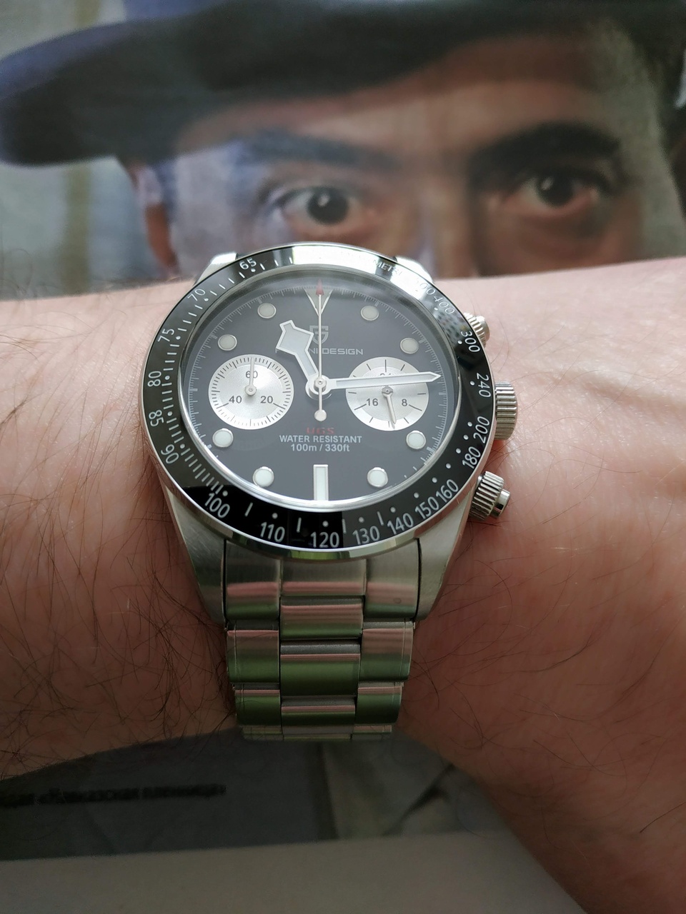 Приехали, наконец, Pagani BB. Браслет монументальный, железа много, но, боюсь, винты со временем будут раскручиваться. Хрон такой же, как на PD-1711, что ранее обсуждались здесь. Т.е., секунды нет совсем, лишь при включенном хроне. Чё-то выпуклое стекло не впечатлило, лучше б плоское было. Наверное, теперь буду думать о PD-1711. Радует, что нету календаря.
