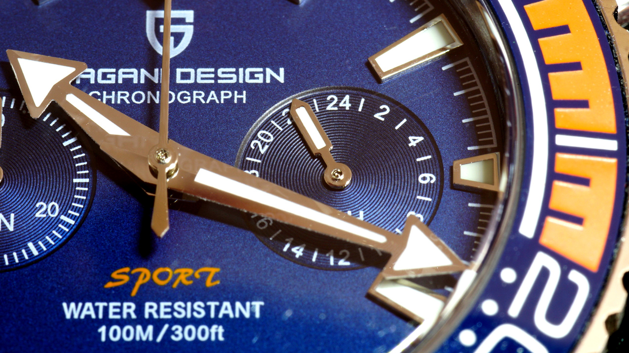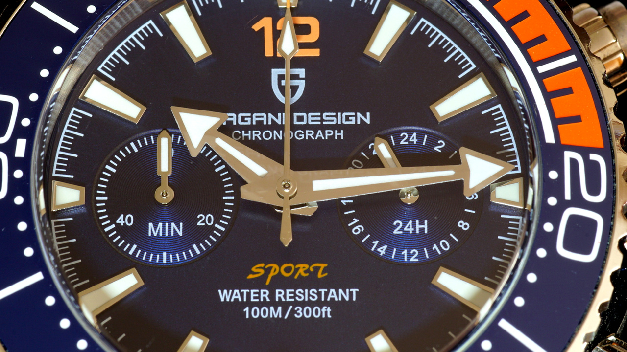 Больше всего боялся судорожно дрыгающуюся секундную стрелку, но как обычно ступил и не учел, что часы хронограф и секундная стрелка 95 процентов времени будет стоять на 12. Хронограф работает нормально, отсчет минут по малому циферу на 9. Цифер на 3 это 24-ех часовой отсчет. Силиконовый ремешок красивый и приятный. Застежка непривычная, но удобная и не расстегивается. Размер ремешка "китайский", т.е. на запястье 19 см придется носить на последней/предпоследней дырочке. Часы относительно тяжелые, 109 граммов, что радует . Люблю увесистые вещи