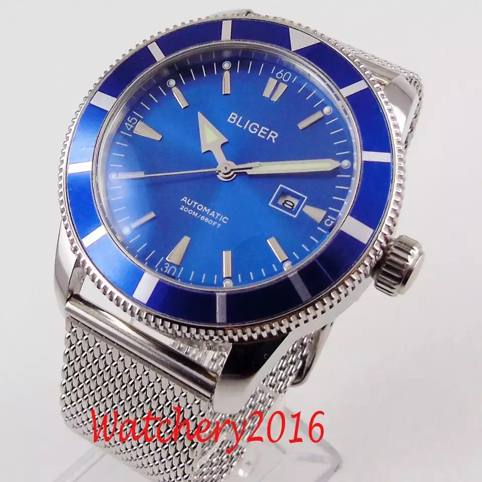 Смотри, что есть на AliExpress! Bliger 46 мм синий циферблат светящийся вращающийся Безель автоматические механические мужские часы за 5 921,29 руб. - уже со скидкой 25%