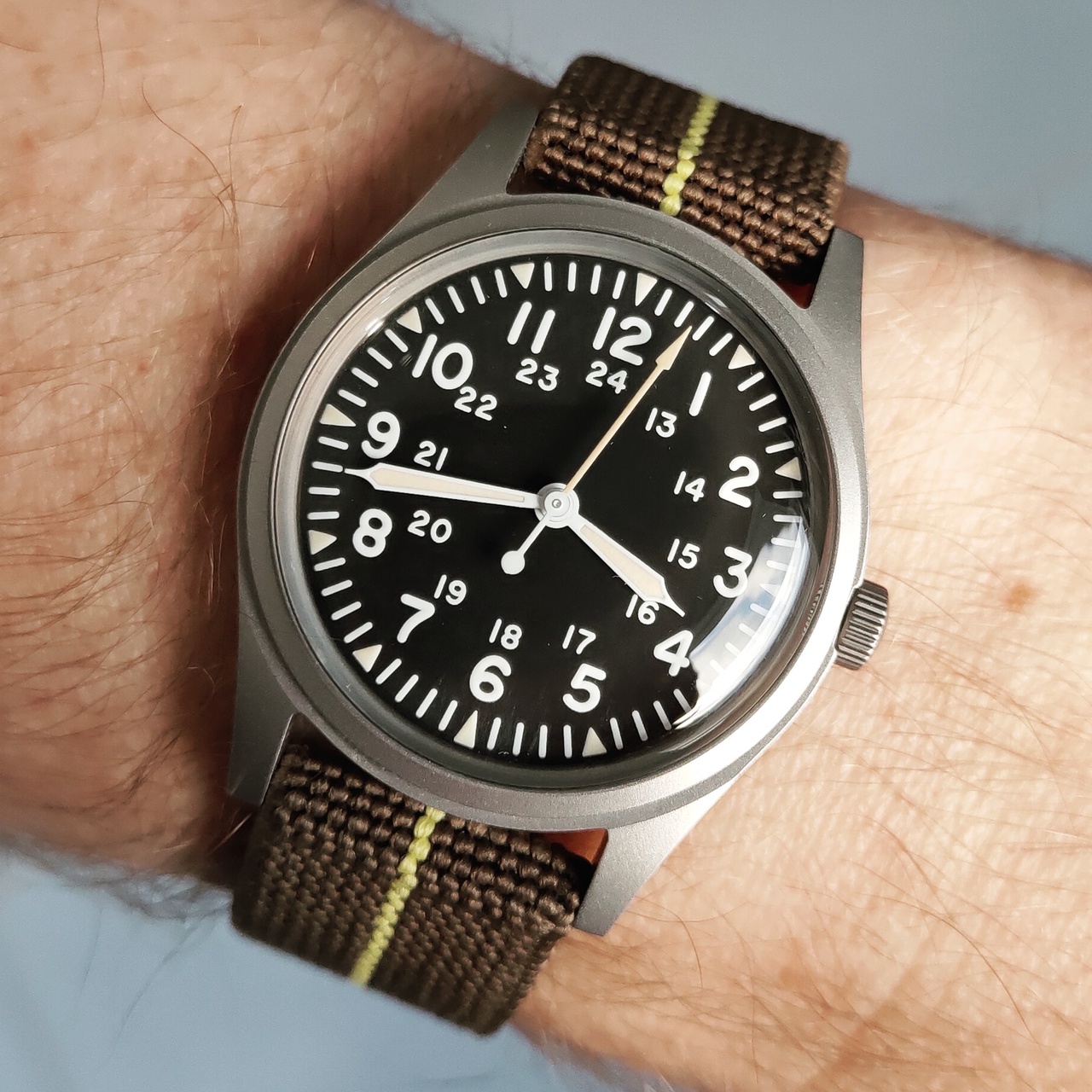 2.Наличие только ручного завода. Еще один из критериев отбора, выдвинутый выше. Что касается механизма, то по заявлению производителя это in house movement. Спорить не буду. Но пусть исправят специалисты, если это не так. Кстати, точность хода я не измерял из-за отсутствия секундной стрелки, что тоже понравилось. Но по наблюдениям идут часы очень точно. За неделю точность не вылазит за пределы минуты. Запас хода не уточнял. При носке завожу каждое утро