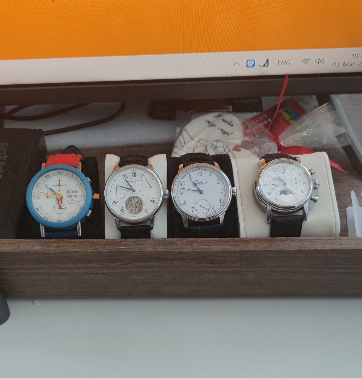 Взял, так как не было в коллекции часов с лунником и китайским хронографом, совместил так сказать в одном лице. Притензий к часам нет (на мой неискушонный взгляд), но ношу редко, служат украшением на столе. Красивые. Но немного спешат.