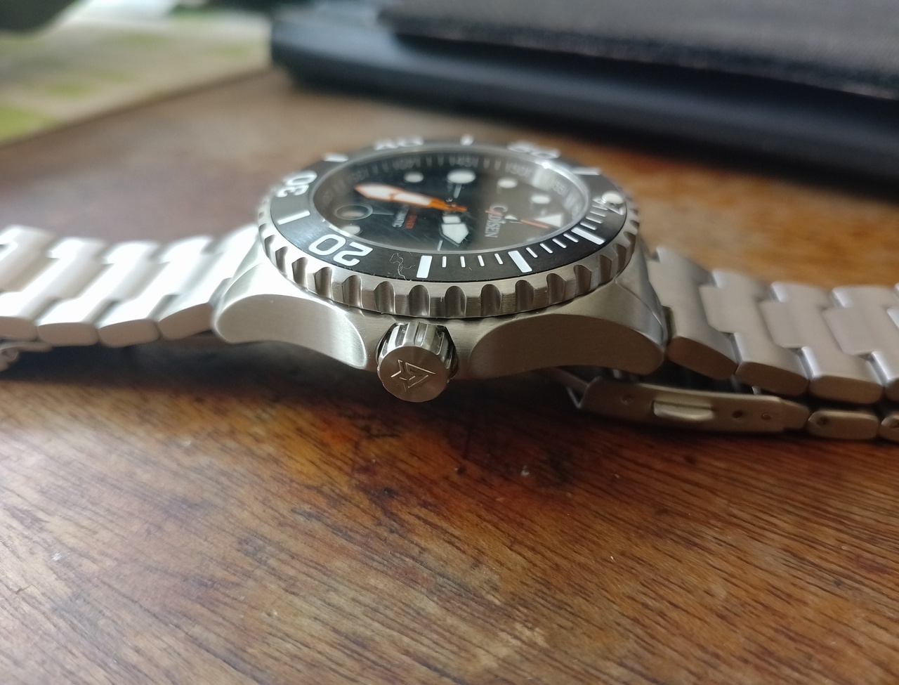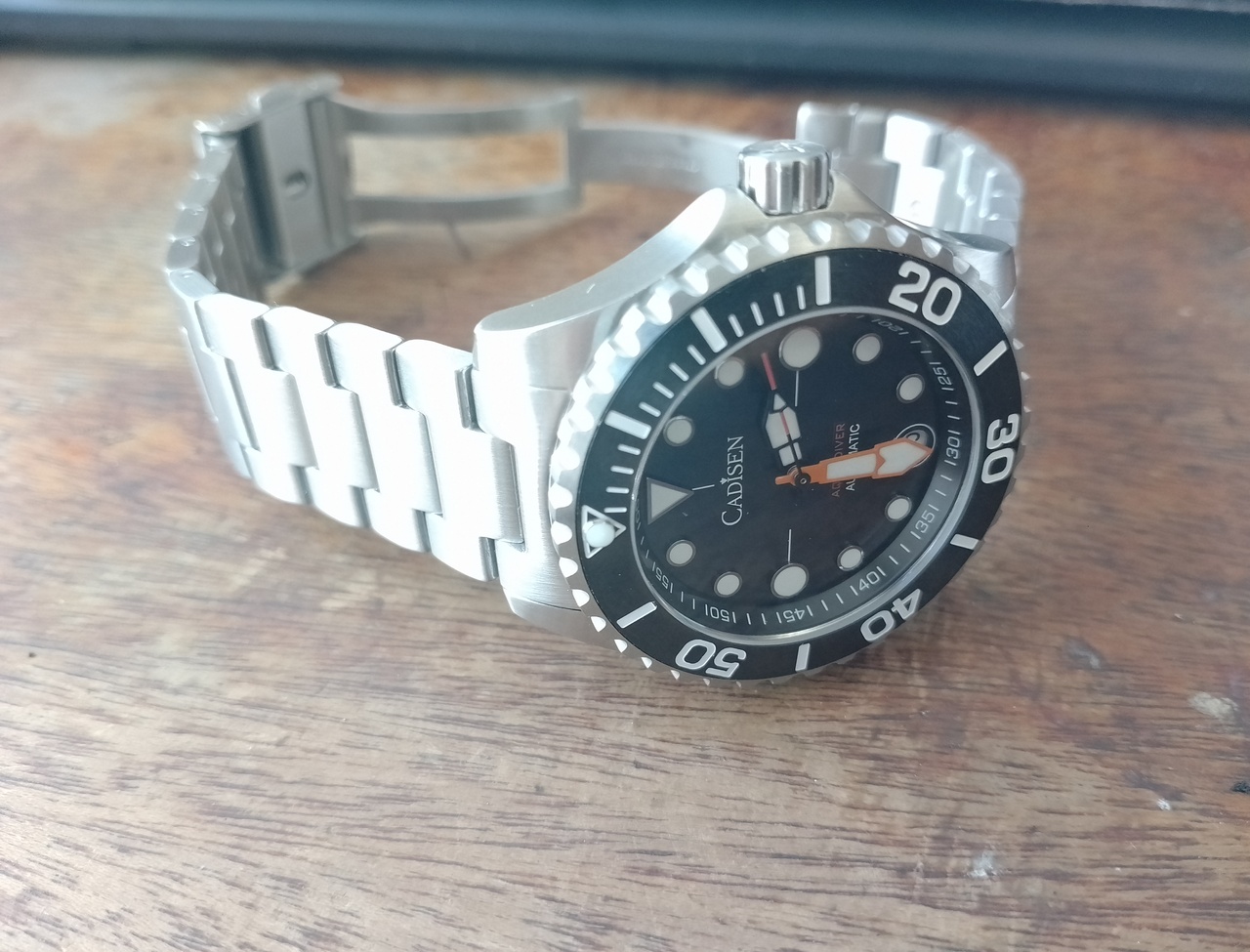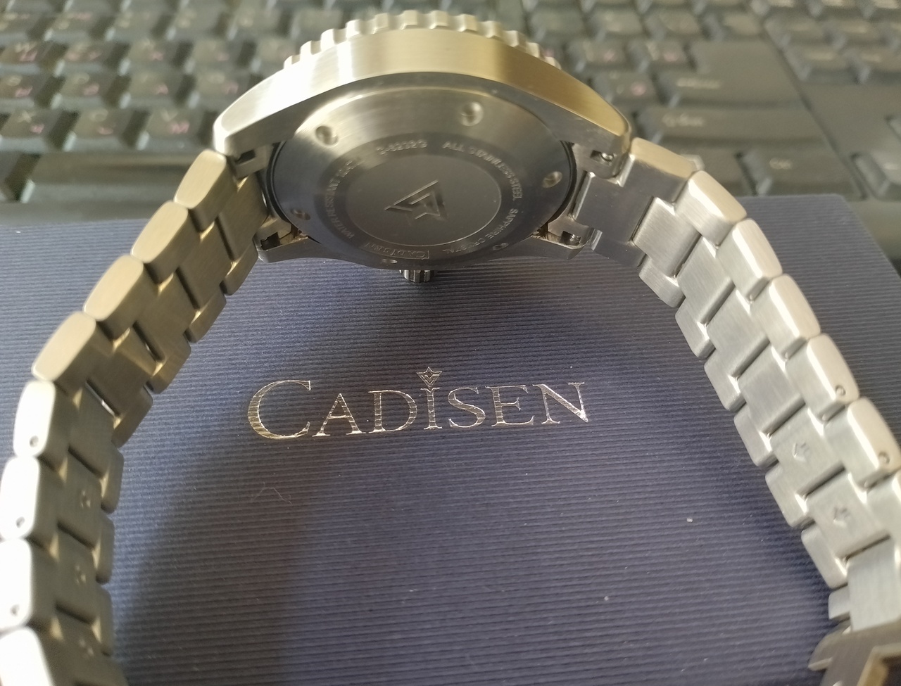 Привет часоголикам! Приехали ко мне мои Cadisen AquaDiver (homage Helm Komodo). За цену 5789 р., что они мне обошлись, считаю, что часы - прелесть. Стекло - сапфир, водо-защита 100м, нержавейка, безель односторонний (чуть люфтит, крутится очень легко со щелчками в одну сторону), браслет удобный, длинный (пойдёт на любую руку, снял пару звеньев), заводная головка большая, ухватистая, удобная, завинчивается долго на несколько витков (оборота 4). За эту цену нет претензий, если бы стоили чуть дороже, наверное, придрался бы к люму, он довольно хреноватый, синего цвета, в остальном от часов только положительные эмоции. Точность хода замерил - +20сек - что для меня не критично (хорошо, что спешат, если бы отставали, тогда бы было хуже). Сразу хочу сказать, часы маленькие 40мм, на моей медвежьей лапе в 19,5см смотрятся довольно маленькими, я привык носить 43-45-48мм; 40мм, конечно, маловаты, но для среднего и маленького запясться будут в самый раз. Интересное расположение окошка даты на 6-ти часах мне понравилось, у меня раньше таких не было, все часы - дата на 3-х часах. Очень неплохие часики с довольно оригинальным дизайном (хоть и хомаж на Хелм Комодо) на лето, да и не только - прелесть, под рубашку и под рукав отлично прячутся.