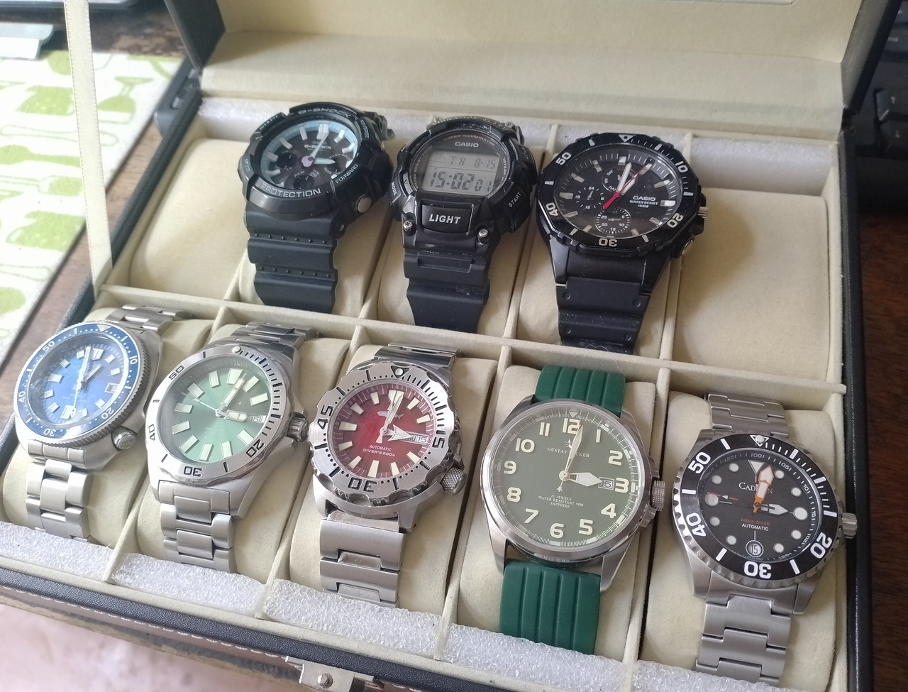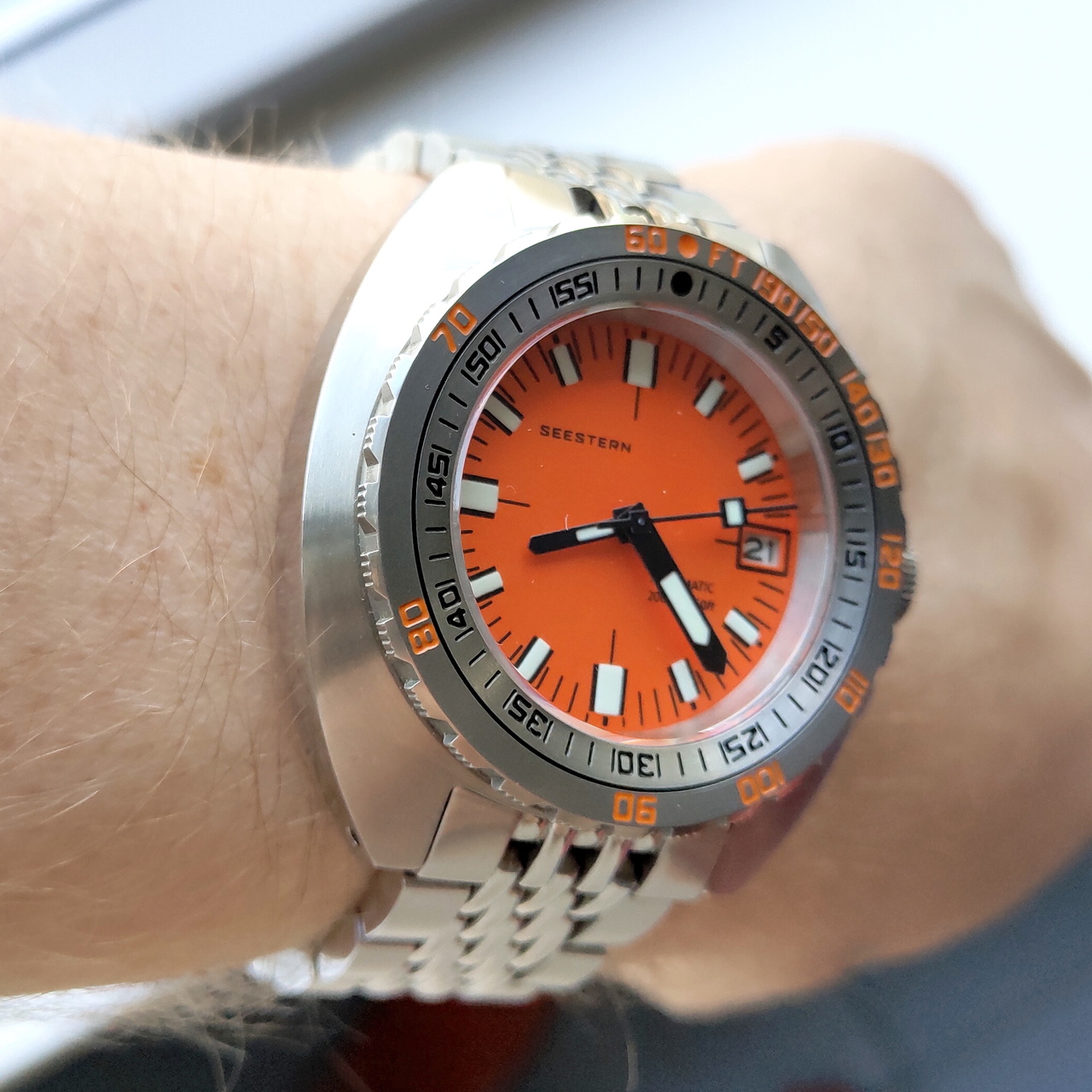 К сожалению, люм красивый лишь на фото, по факту - его, считай, нет, потому не стал и выкладывать фото с ним. Но когда я заказывал, я об этом знал, такое же г... на адиесдайвах используется в синем варианте, на фото у продавца было уже по фото понятно, что нормального люма нет, всё, что не C3 - не светится нормально. Но цена уж больно по акции вкусная была, да и часы, в целом, отличные, аккуратные такие часики. Кстати, первый день из коробки шли +20сек, спустя насколько дней идут -1сек -::- +5 сек, наверное, расходились. Ношу не снимая несколько дней - очень удобная посадка, удобная коронка, удобный безель, хорошо обработанный браслет, жалко люма недоложили :-)
