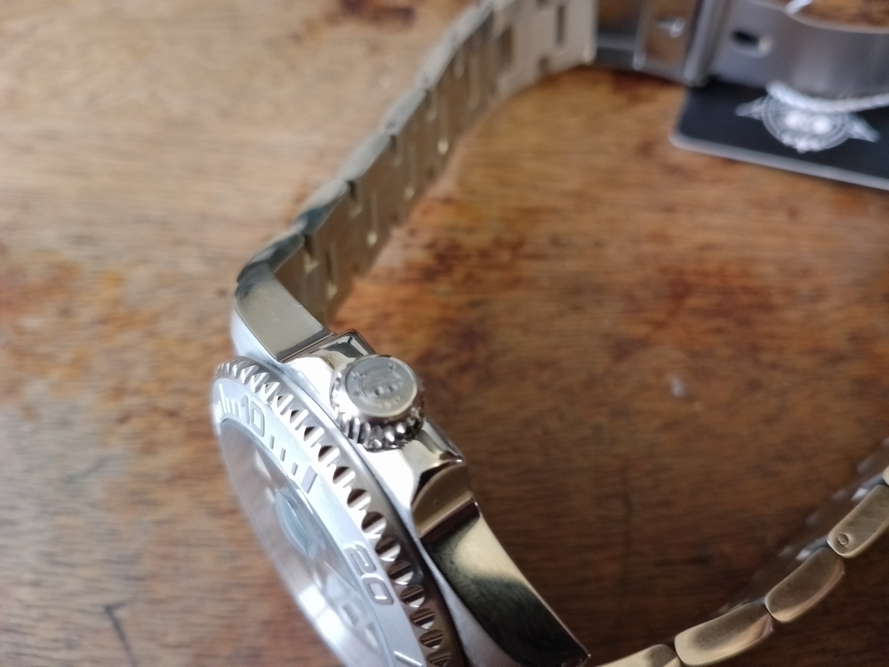200м, минералка хардлекс, сталь. Понравилась коронка, крутится приятно, особенно резьба завинчивается долго и приятно, головка-коронка ухватистая и удобная, число даты вручную головкой переключатся очень мягко, плавно, очень удобно. Задняя крышка имеет лазерную гравировку, которая очень шершавая на ощуп, но при ношении часов это, почему-то не мешает. Обработка браслета хорошая, нигде ничего не режет, все плавно и достойно. Купил в наивной надежде, что там будет люминова, которая заявлена продавцом :-))) Наивность!!! :-))) Конечно же там нет никакой люминовы, особенно BGW9, как указал продавец. Там какая-то лажа, которая вообще не светится почти. Ну, да ладно..., часики симпатичные, лёгкие и достаточно тонкие, чтобы носить удобно под рукав рубашки, или под костюм, и, так как все мои кварцевые часы сводятся к ДжиШокам размером с хоккейную шайбу и часам, похожим на ДжиШоки, типа Casio W-736H-1A, чего-то маленького и повседневного не было, поэтому решил попробовать такой вариант. Эффекта "Вау" не наблюдается, часы аккуратные, симпатичные, отделка по металлу корпуса и браслета хорошая, на четвёрочку, корпус по бокам полированный, сверху сатинированный, браслет сатинированный. Стрелки и метки полированные, переливаюся и блестят, стрелки тонюсенькие, поэтому слепые, читаемость никакущая, особенно в пасмурный день, или вечером и ночью. Что можно сказать, рад ли я покупке, наверное нет, буду ли носить такие часы, наверное, да, как ни к чему не обязывающий вариант, который можно выхватить на бегу из шкатулки и нацепить на руку без необходимости заводить и выставлять время и дату. Купил по акции за 4113 руб. Наверное, больше бы за них не заплатил, но за эту цену на повседневку нормальные, даже, можно сказать, красивые! Сам не являюсь поклонником дизайна Кроллекса, но решил попробовать часы с "циклопом", кто-то говорил, что в них ничего не видно, и они (циклопы) лишь мешают, мне наоборот показался он очень удобным, дату, во всяком случае, в нём видно отлично и чётко и увеличение большое, правда перегораживает добрую четверть циферблата :-). Покупку считаю временным средством купирования часовой болезни в перерывах между выбором "своих" "особенных" часов :-)))