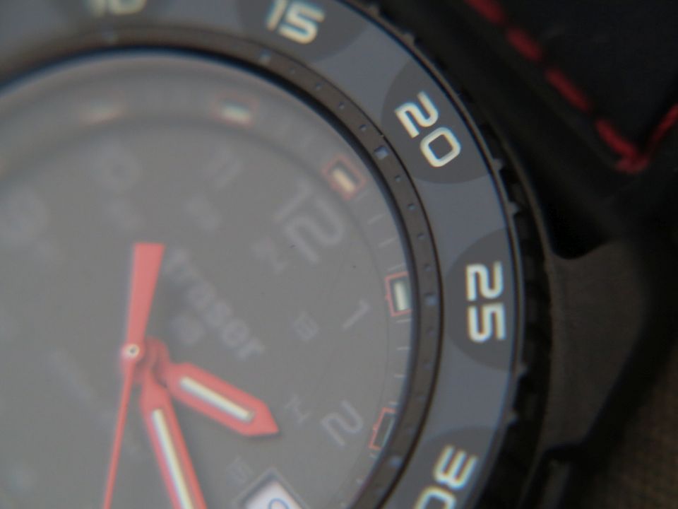 Теперь про тритиевую подсветку безеля. Насколько я знаю, это единственные часы вообще с этой функцией и дайверской разметкой безеля. Есть ещё Ball Aero GMT (сейчас выходит новая его версия с усовершенствованным, искривлённым профилем безеля) – но там он размечен под 3-й часовой пояс. У Red Alert T100 безель не скошенный, прямой. Закрыт, как я понимаю, круговым сапфировым стеклом, покрашенным с обратной стороны, с окошками в форме цифр и знака H3, под которыми размещены крупные тригалайты.