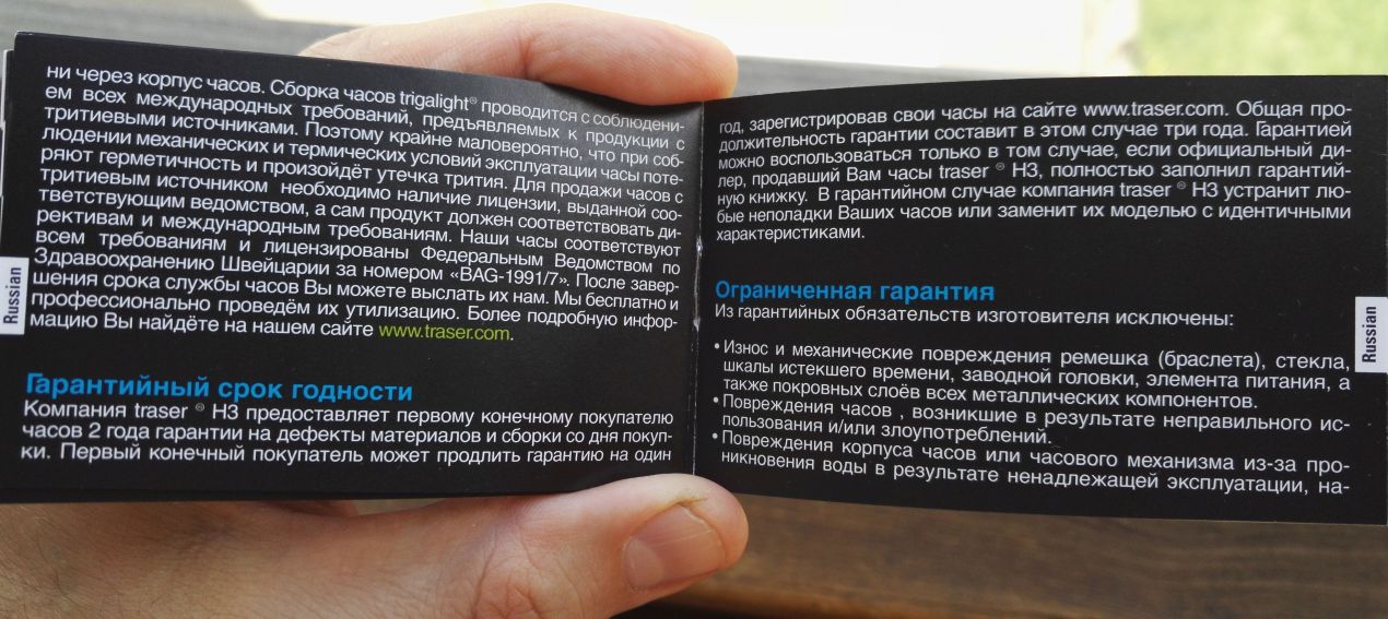 Коробка маленькая, но аккуратная. В комплекте идёт довольно подробная и качественно изданная инструкция, в т.ч. на русском языке, целая брошюра маленького формата (с P6600 Sand, который покупал в alltime, был только один невнятный отксеренный листок). Русскоязычный текст занимает 10 страниц, в том числе с информацией о безопасности использования часов с тритием. Приведу его отдельным сообщением ниже.