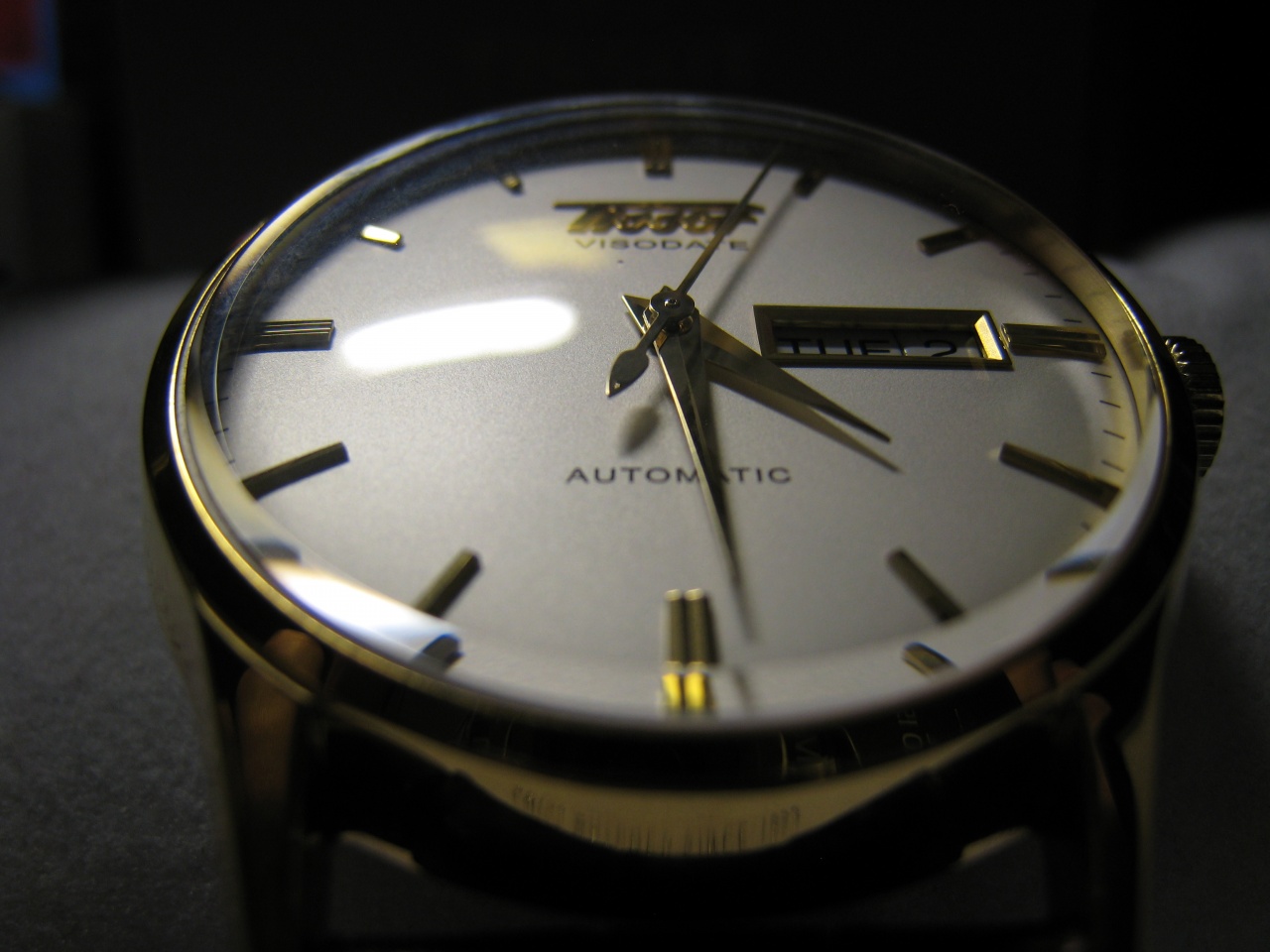 В Ле Локле нравится рифленый цифер (это гильоше называется?) и римские цифры, а в Визодэйт - день недели, винтажный лого, выпуклое стекло, выделенные метки часов.. Долго не мог сделать окончательный выбор, терроризировал друзей)) Единственное сошлись на мнении что надо идти и мерить все в живую. Сказано - сделано! Померил, повертел в руках и понял: Визодэйт - мое!