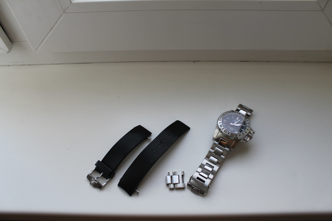 В комплетке: Часы + Оригинальный браслет с дополнительными звеньями (длина на большую руку) + Оригинальный каучук с оригинальными винтами для крепления.