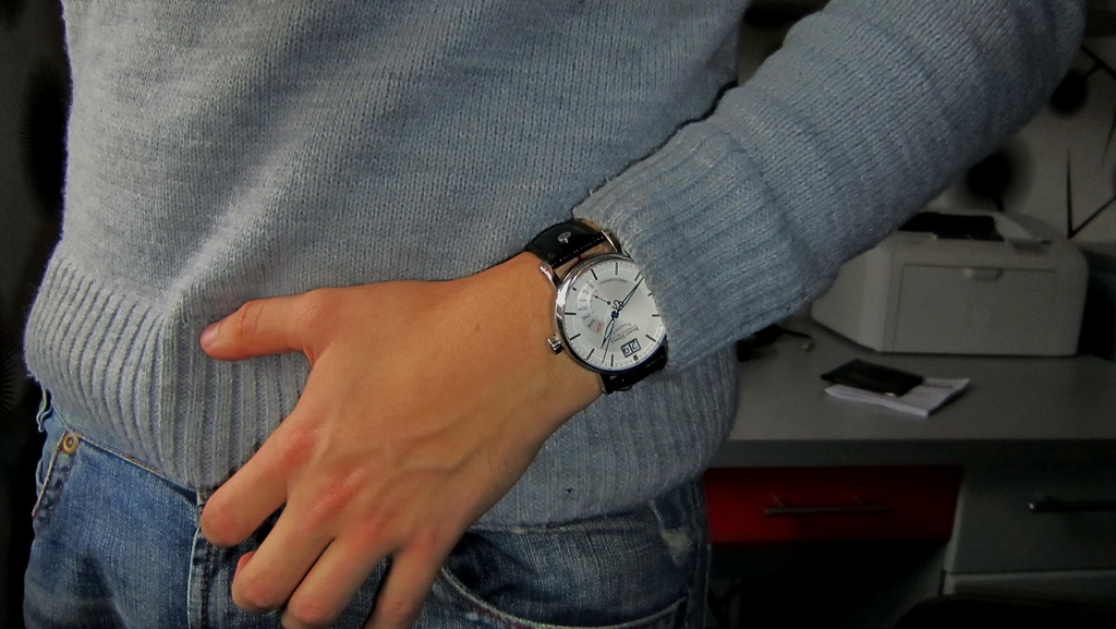 Ну а дальше, дальше пошёл мониторинг рынка – влюблённость в линейку Песаро II, задумки заказывать из Штутгарта (так как старые цветовые решения этой линейки уже были сняты с производства – соответственно не представлены в Украине, но легли к сердцу), заморочки в изучении вопросов с налогами и таможней, а затем была поездка в Киев, прям перед проплатой по безналу гер продавцам, было разочарование в исполнении именно этой модели (субъективно гильоширование в ней ну никак не укладывается с метал. обводкой секундной и дневной шкалы). Ну и после некоторых размышлений я остановился на младшем (по номенклатуре) брате так полюбившейся мне линейки. А в итоге и завладел им.