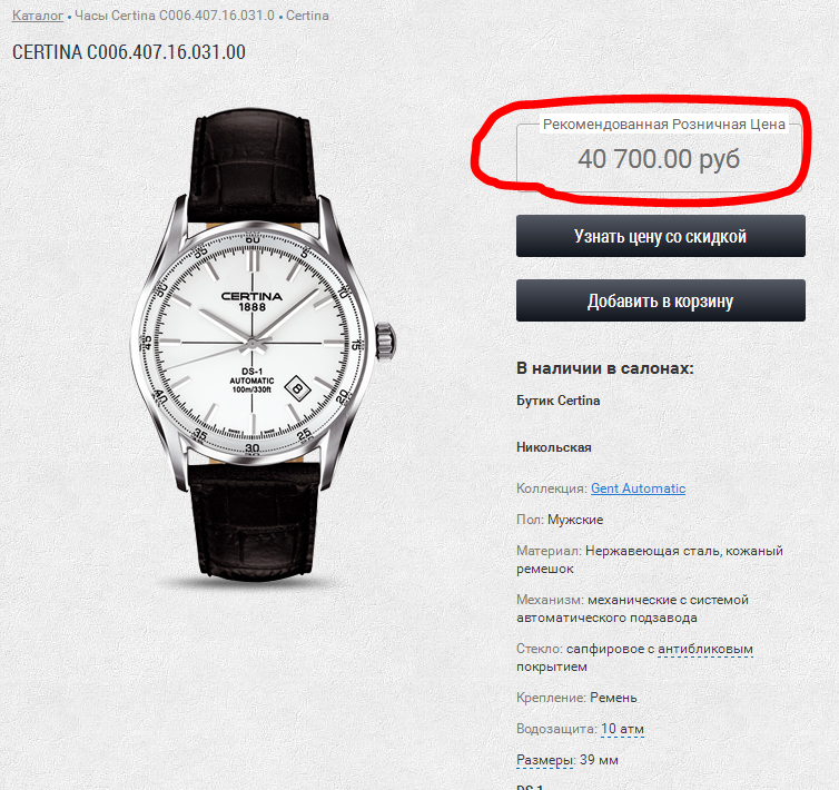 CERTINA DS-1 Auto C006.407.16.031.00. Светлый цифер / Черный ремешок / d=39mm / ETA 2824-2 - Часовой форум Watch.ru