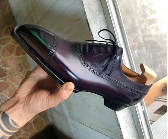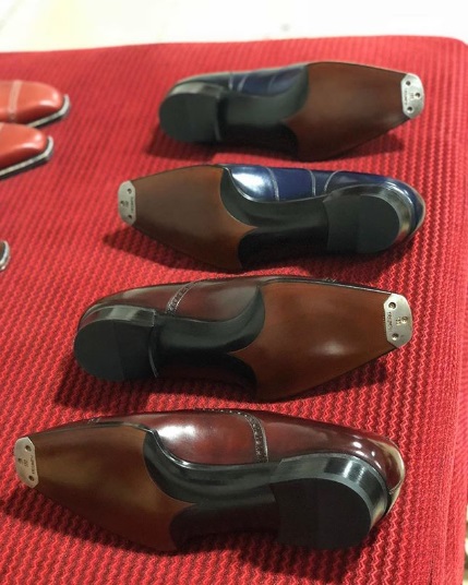 Кожа Vegano у Кармины - это краст доведенный до нужного цвета восками (бернишинг). Сантуш большую часть своей линейки делает как покрашенный краст белого цвета в патину кисточкой либо в сингл цвет тоже кисточкой, это позволяет им хранитт неокрашенную, но уже готовую обувь на складе и красить под заказ.