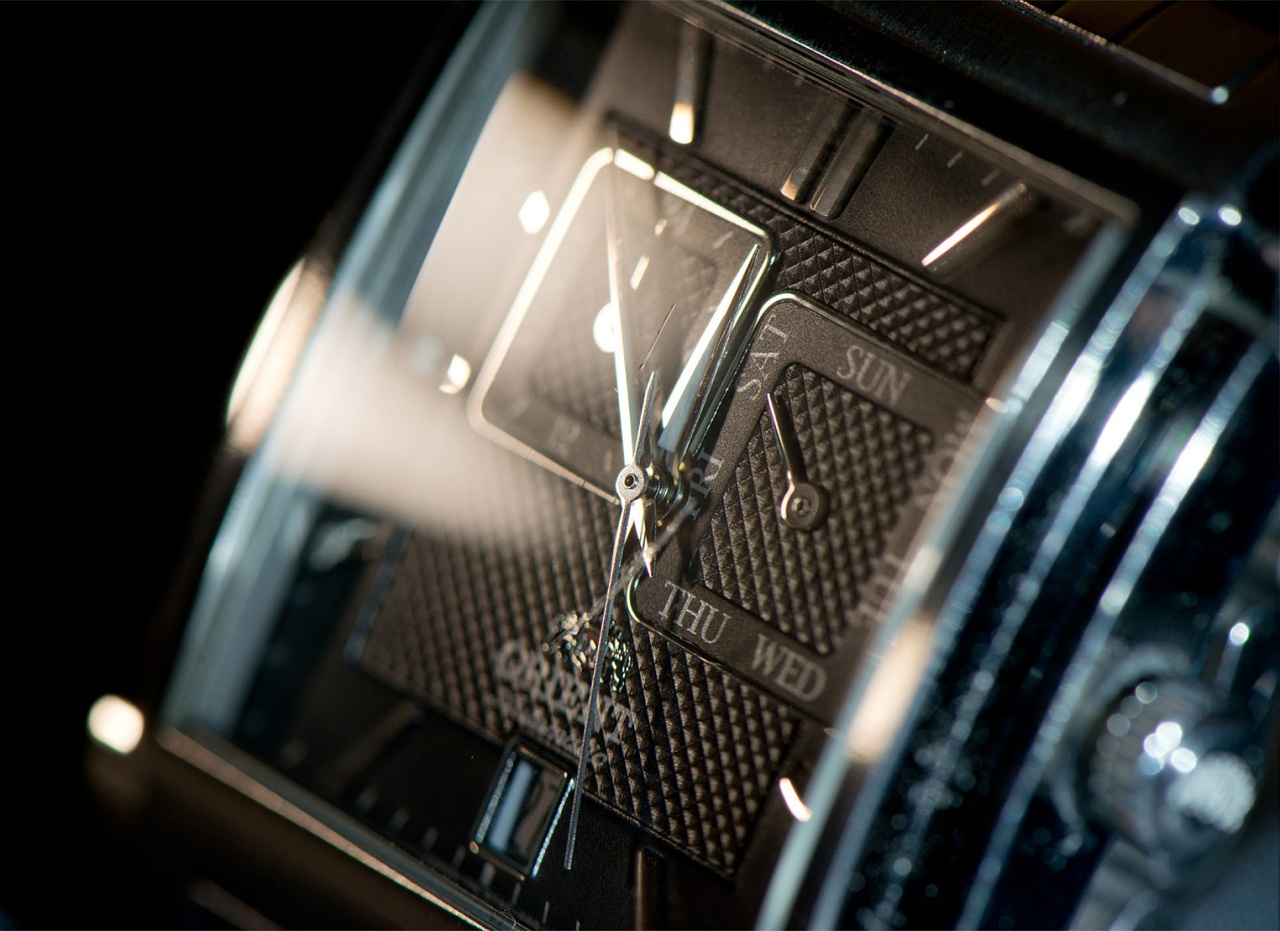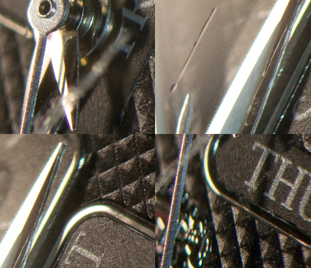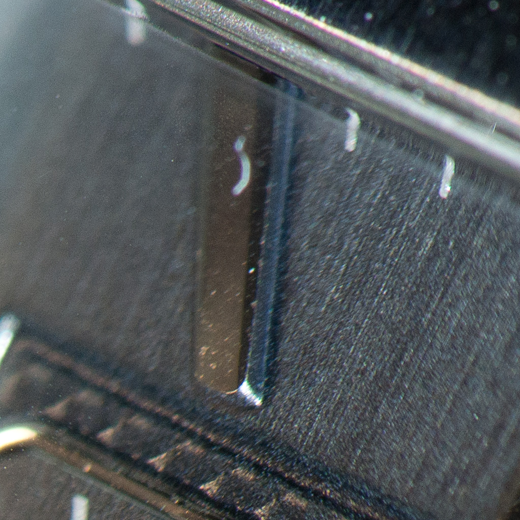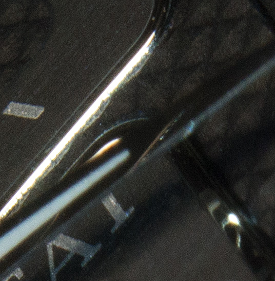 Слева снизу, справа сверху видно отчетливое отражение дефекта кристала в минутной стрелке, слева сверху в фаске минутной стрелки отражается секундная.