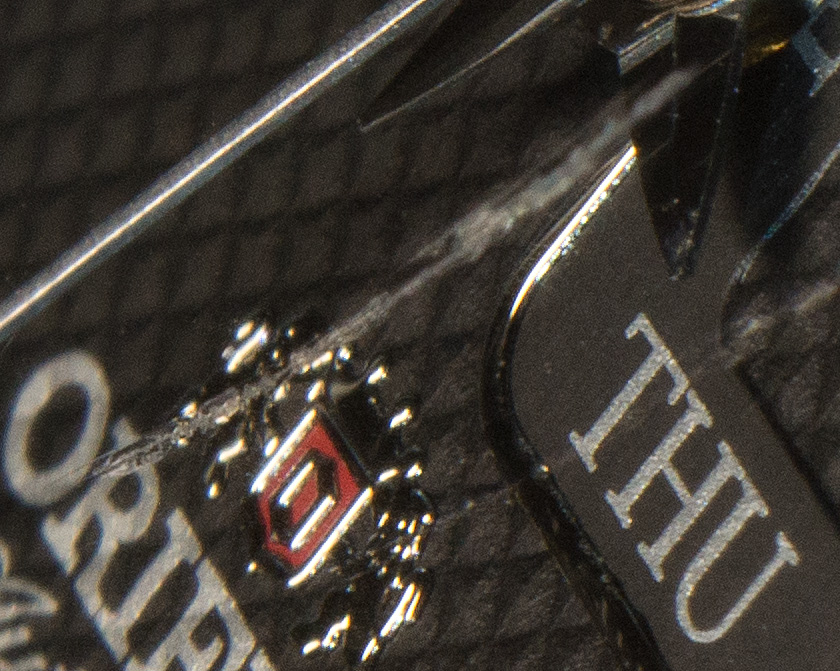 Здесь мы видим, во-первых качественный накладной логотип, во-вторых, вполне приличное качество покрытия или поверхности рамок малых циферблатов, а в-третьих, как как зверски смотрится царапина на кристале. Видно,