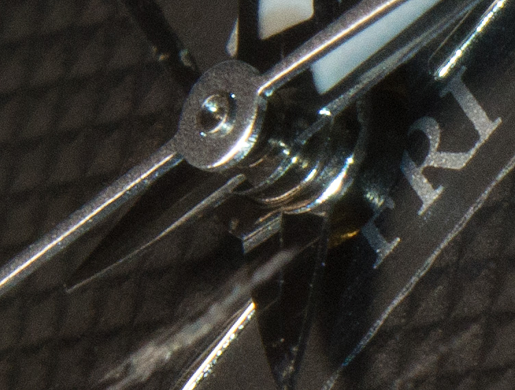 Здесь видим оформление окна даты. Шрифт тонкий, с небольшими потеками нанесения. Каретка окошка даты с покрытием не слишком ровным. Хотя может это просто пыль дает эффект неравномерного свечения. Выше можно оценить качество нанесения среднего шрифта на гиольш цифера. Гиольширование простое, пирамидками небольшой высоты. Однако текст не расплывается и не искажается, хотя рельеф цифера легко улавливает свет и строит тени.