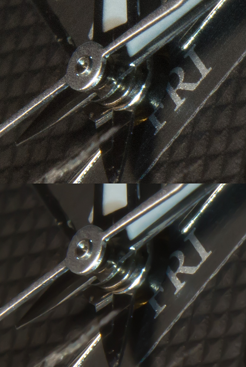 Больше при текущих условиях освещения просто не видно. Надо добавить света. Последнее изображение иллюстрирует, как можно ошибиться в оценке качества отделки при работе шумодава. С включенным, или вообще не отключаемым, как это часто бывает в мыльницах, детали могут просто задавиться вместе с шумом, представив на фото имитацию вполне качественной отделки всех элементов часов. Представьте,