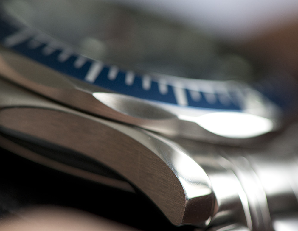 Торцы в том же сатине. Ребра вполне ровные, без завалов. А вот внутренние части браслета обработаны кое-как, плюс, сказывается нагрузка первого звена, несущего на себе воздействие не легких часов: