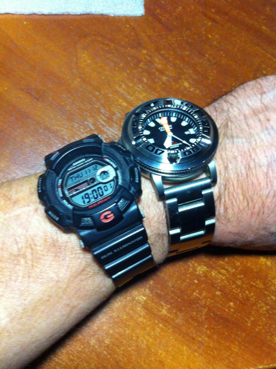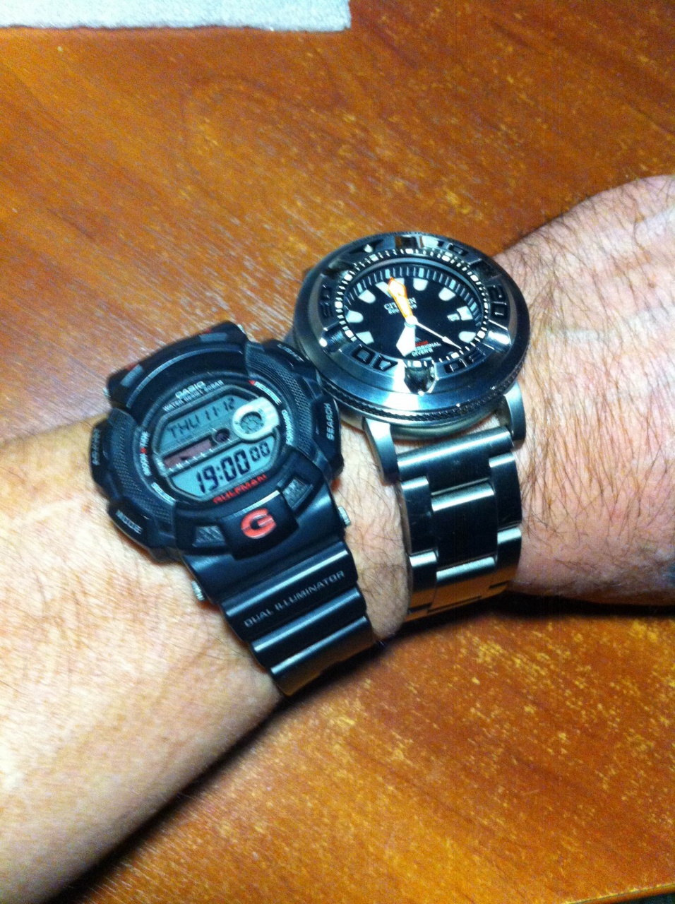 Citizen: EcoZilla Ti, JY8020-52E; Maurice Lacroix PT6058, Casio: Sea-Pathfinder SPF-60, Frogman GF-8230, Frogman GW-200Z, Frogman GW-225C, Frogman GW-200MS, GW-5000, Manaslu PRX-2000T Были: Casio King GXW-56, Seiko Sumo, MTG-S1000D