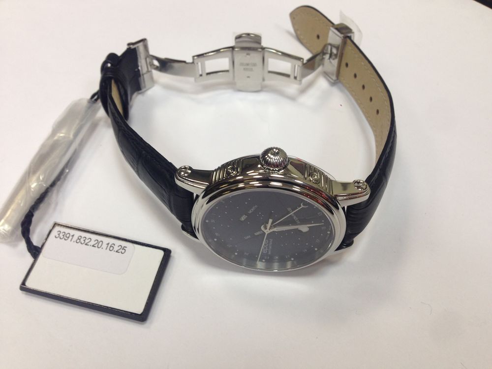 Декорированный механизм ETA 2892 9000 DD. Дата отображается центральной стрелкой. День недели, месяц, фазы Луны. Прозрачная задняя крышка. Люминесцентные стрелки и метки. Кожаный ремешок.