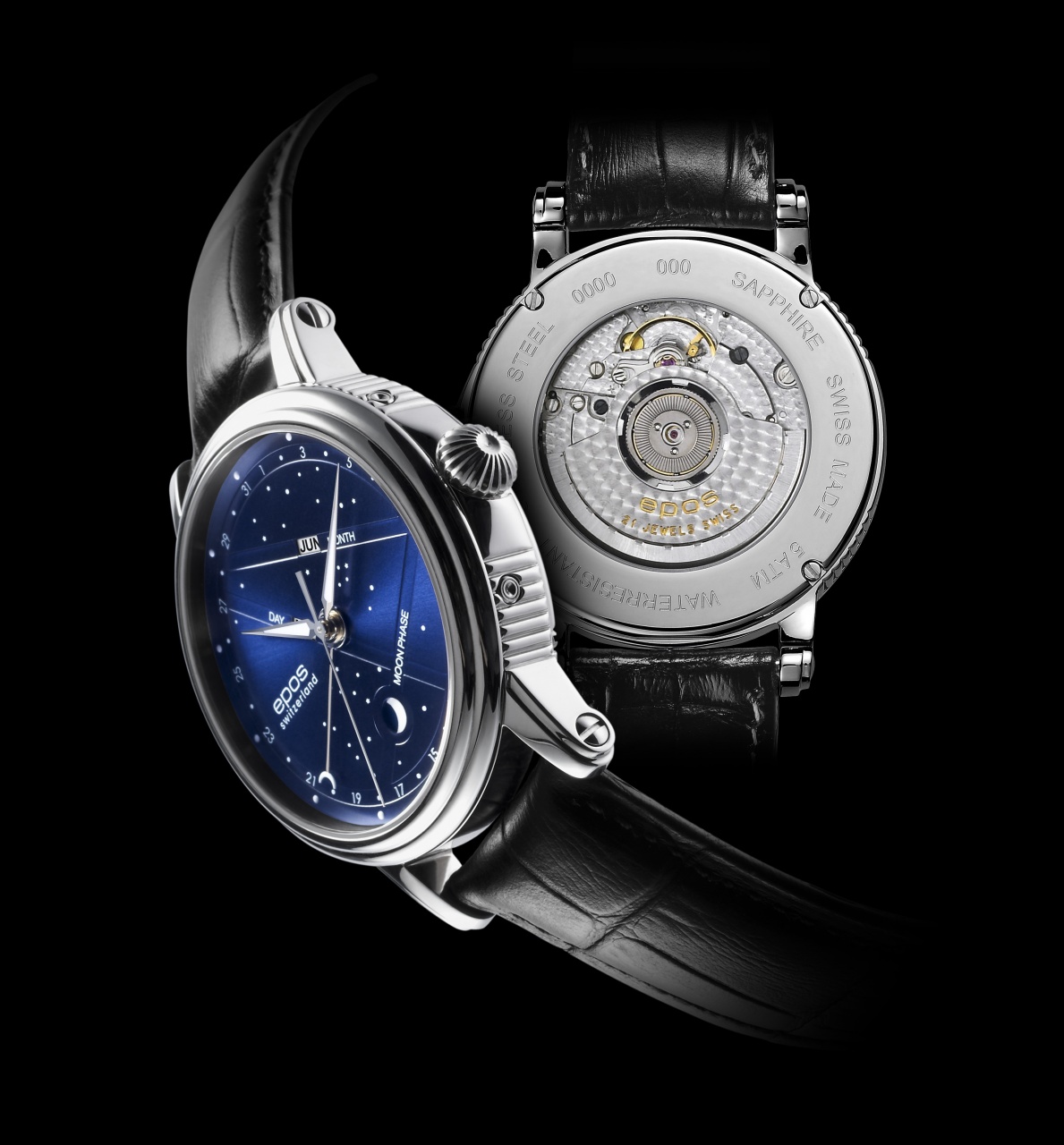 Декорированный механизм ETA 2892 9000 DD. Дата отображается центральной стрелкой. День недели, месяц, фазы Луны. Прозрачная задняя крышка. Люминесцентные стрелки и метки. Кожаный ремешок.