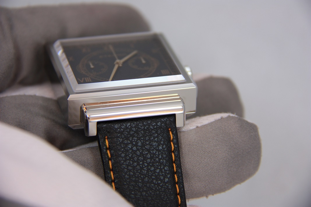 Новинка представлена в массивном корпусе прямоугольной формы, изготовленной из нержавеющей стали. Часы очаровывают своим винтажным обликом с мягкими цветами циферблата и ремешка. Размеры корпуса составляют 45 мм х 36 мм х 13 мм. В элегантном стальном корпусе комбинированы отполированные и матовые поверхности, придающие часам превосходный вид. Из виду дизайнеров компании не упущена ни одна мельчайшая деталь: даже кнопки хронографа на 2 и 4 часах сатинированы сверху и отполированы по краям. Лицевая сторона корпуса оснащена сапфировым стеклом с антибликовым покрытием, которое крепится к корпусу тонким безелем из нержавеющей стали с матовой поверхностью. Водонепроницаемость корпуса достигает до 50 метров.