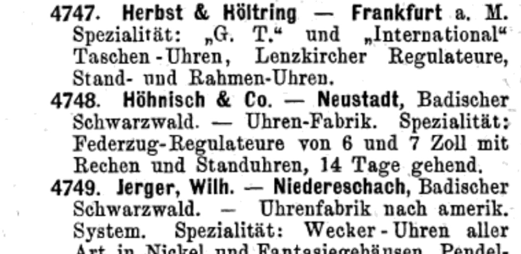 Я еще нашел отличный справочник за 1894 год - "Export-Hand-Adressbuch von Deutschland", здесь в одном месте перечислены все часовые фабрики, действующие на момент 1894 года: https://books.google.ru/books?id=PI9...page&q&f=false