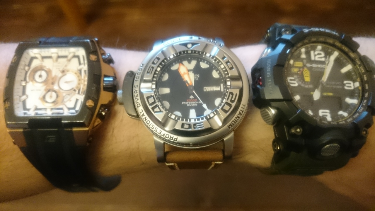 Citizen: EcoZilla Ti, JY8020-52E; Maurice Lacroix PT6058, Casio: Sea-Pathfinder SPF-60, Frogman GF-8230, Frogman GW-200Z, Frogman GW-225C, Frogman GW-200MS, GW-5000, Manaslu PRX-2000T Были: Casio King GXW-56, Seiko Sumo, MTG-S1000D