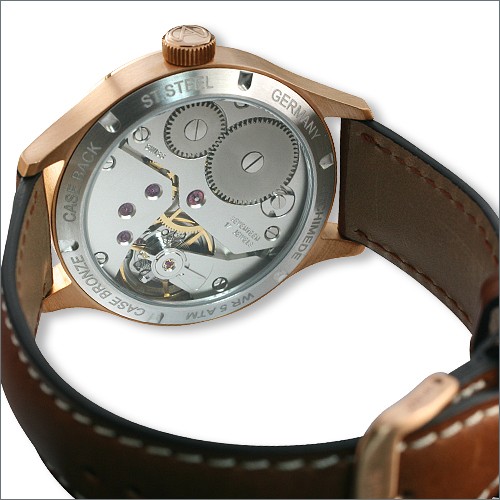 ICKLER Case, сделан в Пфорцхайме. Материал корпуса: Бронза (CuSn8), диаметр 42mm, толщина 10,5mm, сапфир с антибликом защищает циферблат, сзади окошко из минералки, заводная головка из бронзы с логотипом компании, водозащита 5 ATM.