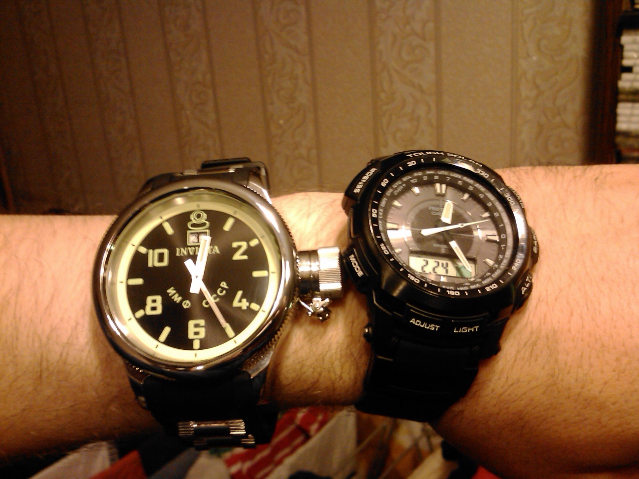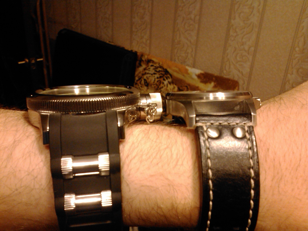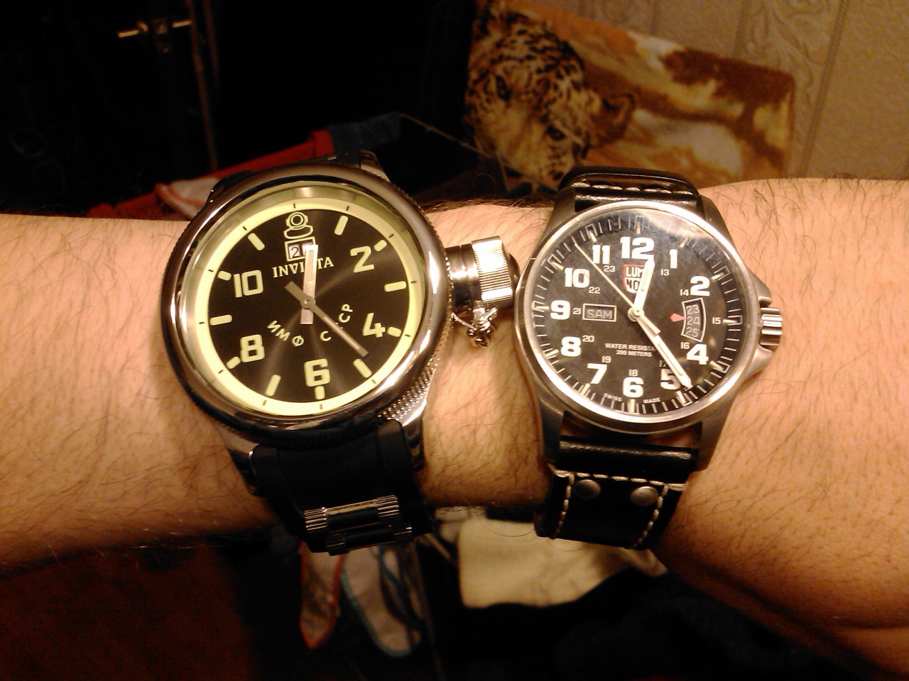 Ну и фото, по традиции, на волосатой руке, и в сравнении с весьма крупненькими протреками и люминоксами. Обратите внимание на размер стрелок у этих "мелких" часов