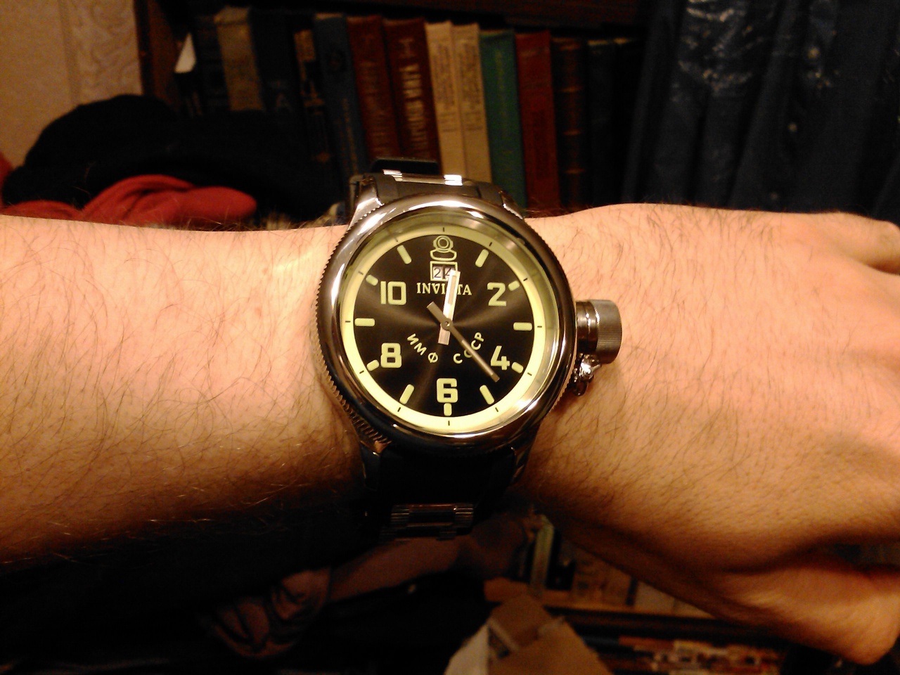 4) Цифер. Цифер хороший, крупный и легко читаемый. А вот стрелки - мелкие, не того цвета и явно не от этого размера часов, они как бы теряются на фоне всего этого благолепия. В темноте - вообще забавно, ярко сияет обрамляющее кольцо, на его фоне все остальное меркнет, и стрелки в первую очередь - на них люм тоньше всего=)