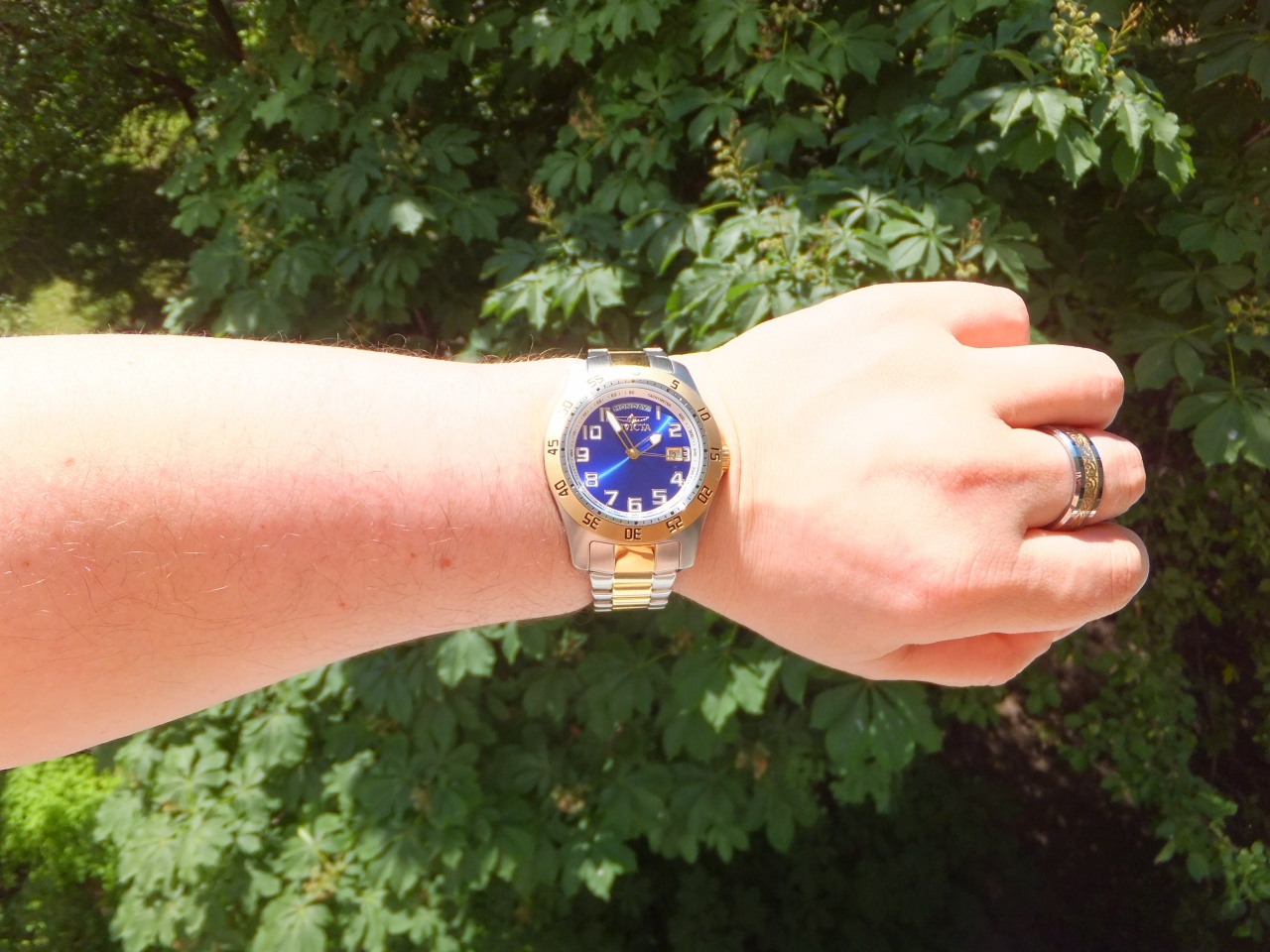 Еще одни. Invicta 5253, докинул в заказ просто так. Кварцевые простенькие. Сами часы вполне себе приличные, а вот браслет разочаровал. Сборный, пустотелый. Китайцы давно на свои модели от 35-45 долларов ставят приличные (а изредка и отличные) литые. Впрочем, прямо сейчас браслет не звонкий, это уже в плюс. Ну и фото.