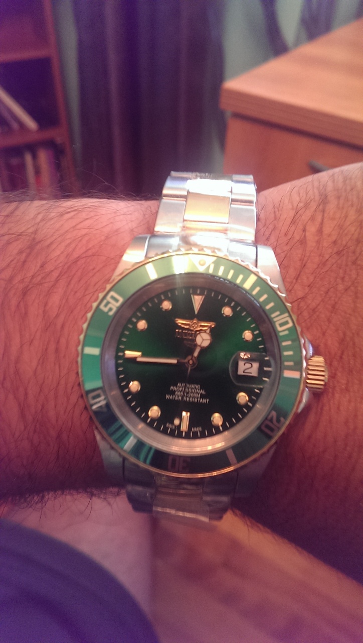 Сегодня я получил Швейцарские Инвикты модели 18509. Мне повезло и на аукционе Ебэй они мне достались с пересылкой за 200$. Лупа на стекле как у Ролекса х2.5, ЕТА механизм. Всё мне в них устраивает, кроме... Цвета. Этот ярко зелёный цвет в сочитании с позолотой делает эти часы слишком яркими.