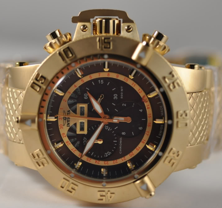 Invicta Subaqua Noma III 5400.Оригинал, никаких копий! Настоящий дайвер - 500 м! SWISS MADE..Механизм ETA G10.211 .13 камней.Швейцарский кварц .Стрелки и разметка с люминесцентным покрытием. Вращающийся с фиксацией в одну сторону безель и закручивающаяся заводная головка. Циферблат: коричневый,Число,месяц, день недели. Хронограф: 1/10 сек.,60 сек.,30 мин Специальные водонепроницаемые устройства на кнопках и заводной головке. Новые, в пленке, коробка, инструкция , гарантийный талон. Крупные/тяжелые.Сапфир с антибликовым покрытием..Полностью позолоченные вместе с браслетом - 18к золото. Диаметр 50, высота 17 Цена в интернет магазинах от 45000. Продаю за 27000 рублей. Здесь инфа по марке -