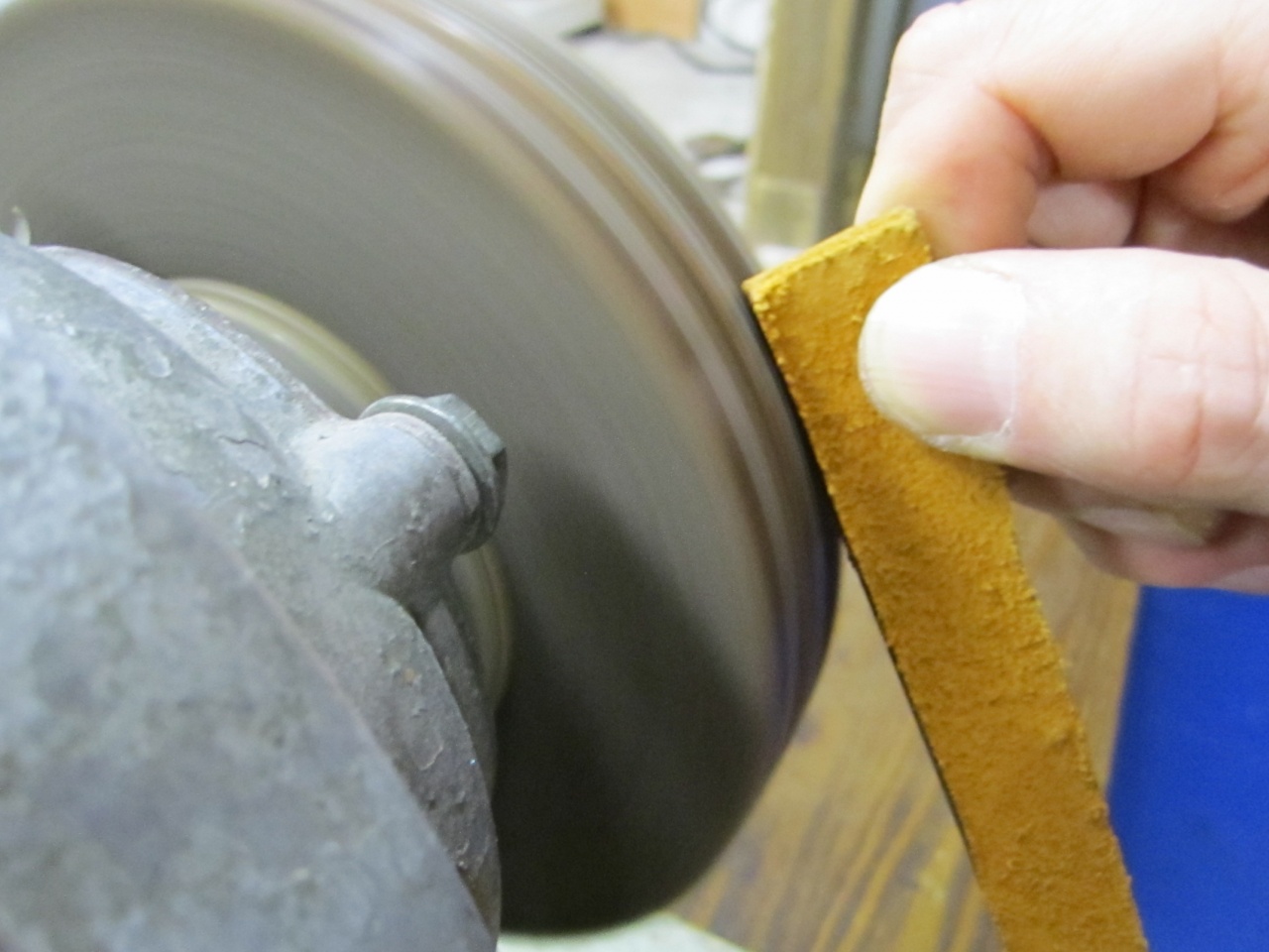 Для начала надо надеть войлочный круг на электроточило. Потом нанести воск на войлок, когда он вращается. После этого можно полировать изделие.