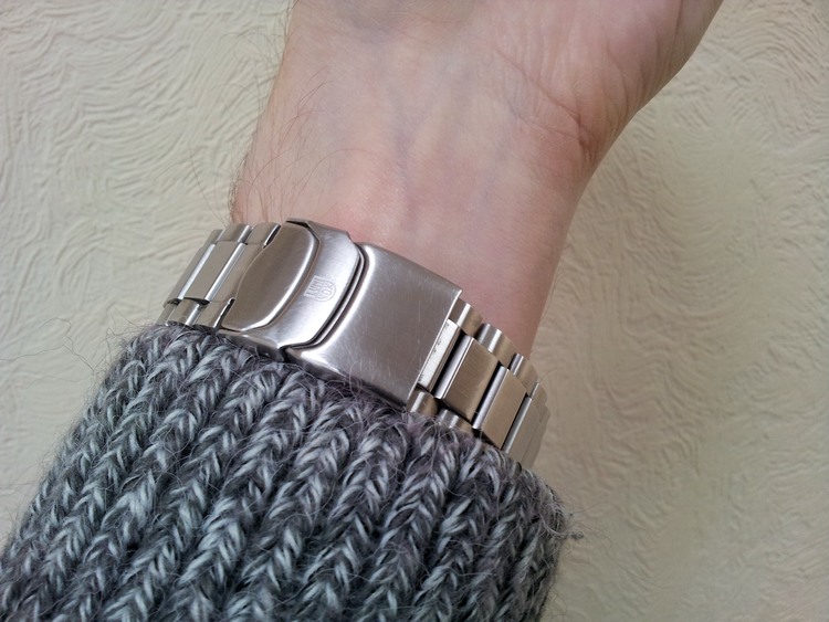 Сильно приглядевшись нашел. Он еле-еле проглядывает. Так не должно быть. Сам браслет не поблескивает, а больше на матовый похож.