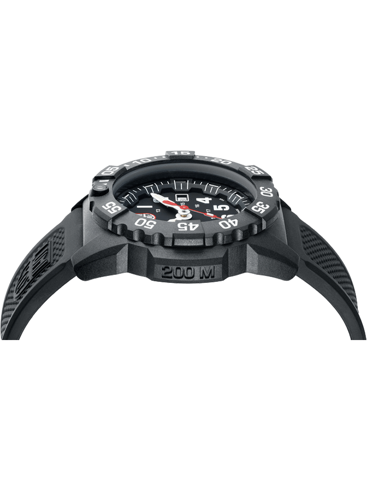 Тритиевые трубки расположены горизонтально, все зеленого цвета, кроме оранжевой на 12 часах. На стрелках трубки так же зеленого цвета.